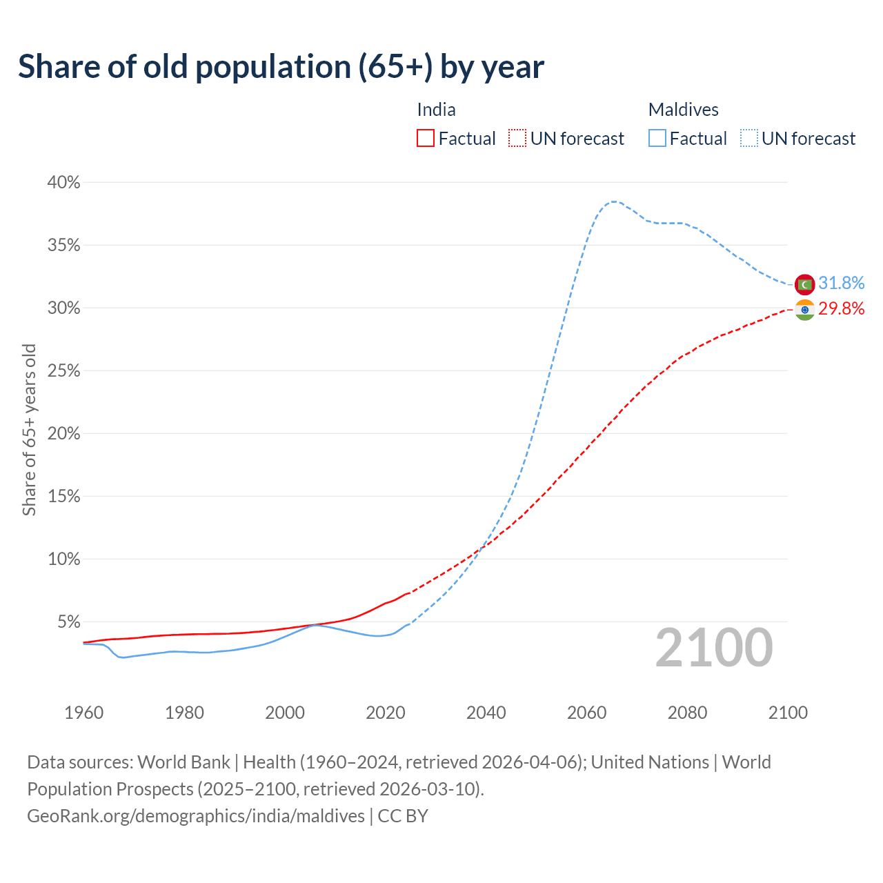 - The share of old-age demographic (65+) in India is 7.15% vs 4.64% in Maldives.