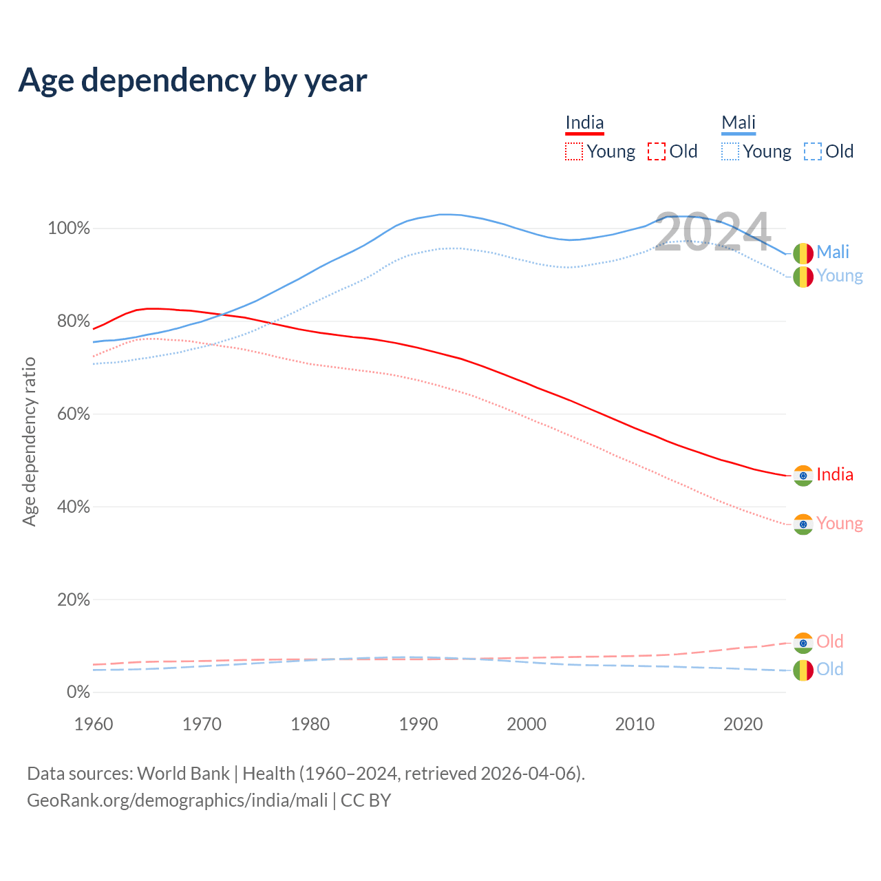 - India is ranked 108/196 by median age (oldest to youngest) vs 193/196 for Mali.