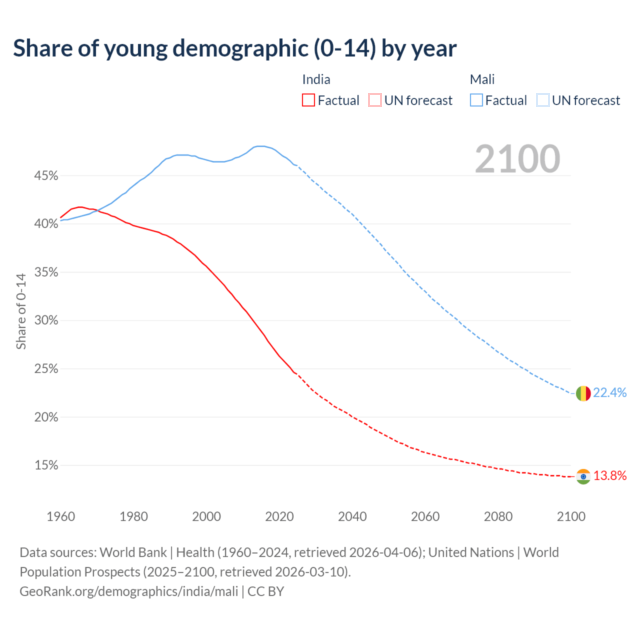 - The share of young demographic (0-15 years old) in India is 24.6% vs 46.1% in Mali.