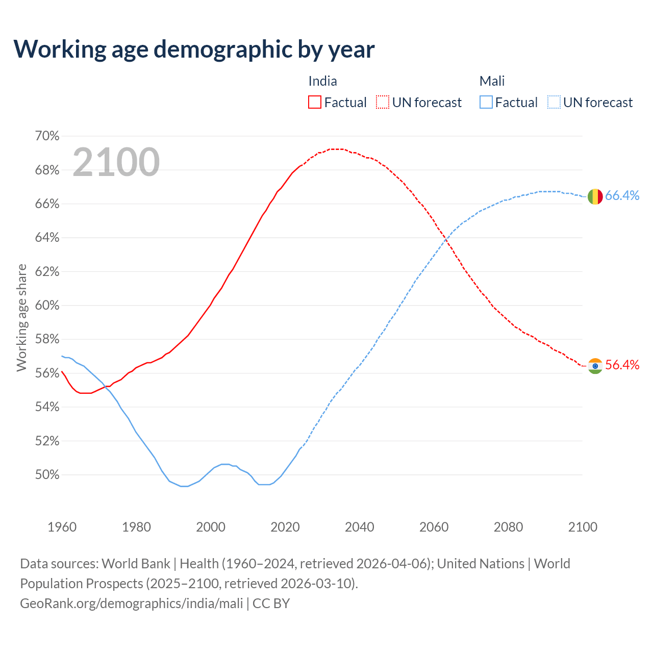 - India has 1.01B working age adults (aged 15-64) vs 13.5M in Mali.