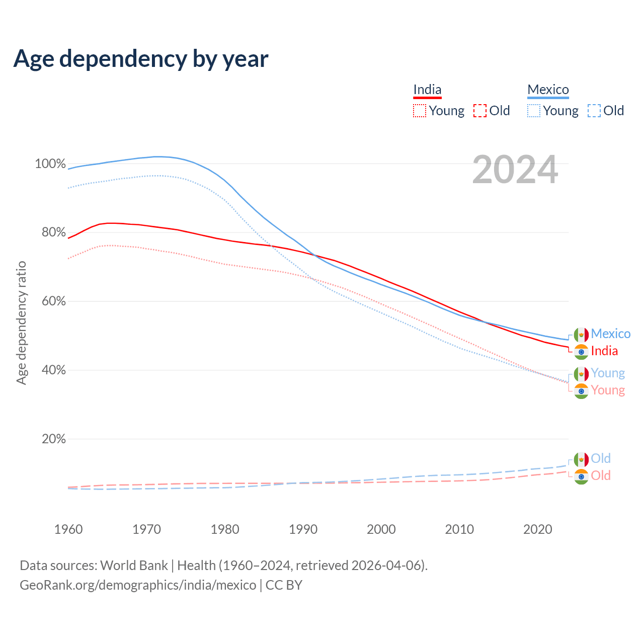 - India is ranked 108/196 by median age (oldest to youngest) vs 102/196 for Mexico.