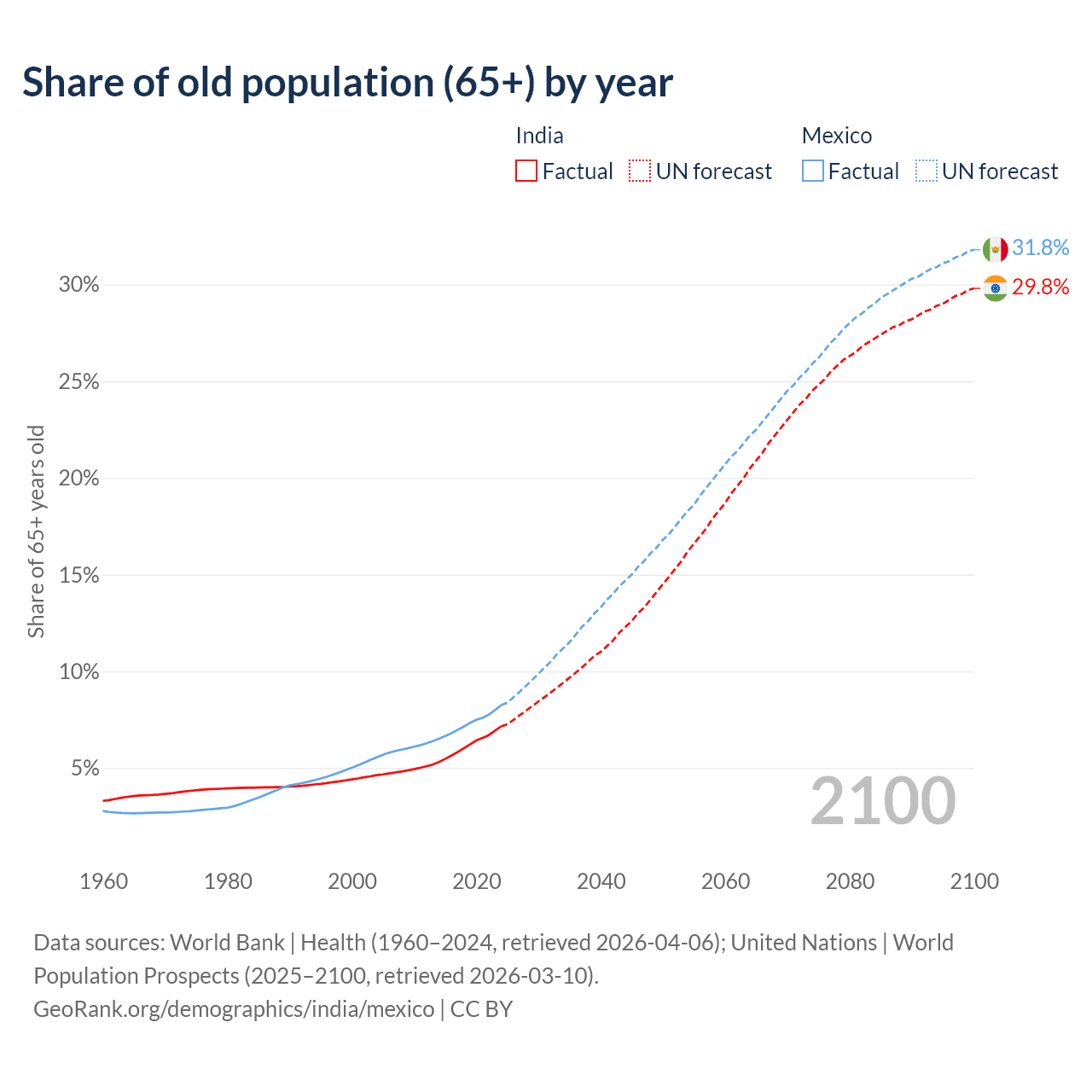 The share of older people aged 65 and over is 7.15% in India and 8.25% in Mexico. Life expectancy in India compared to Mexico .