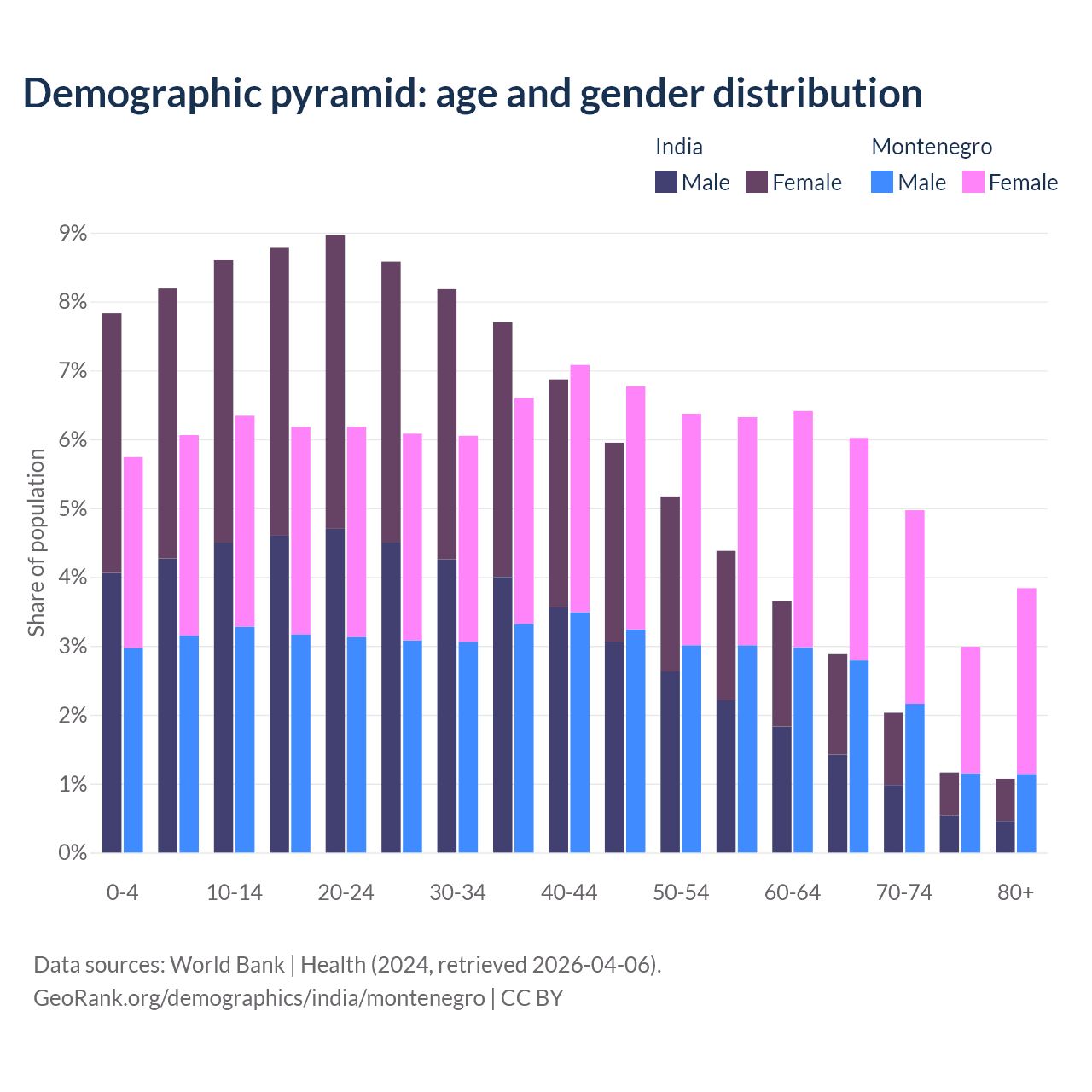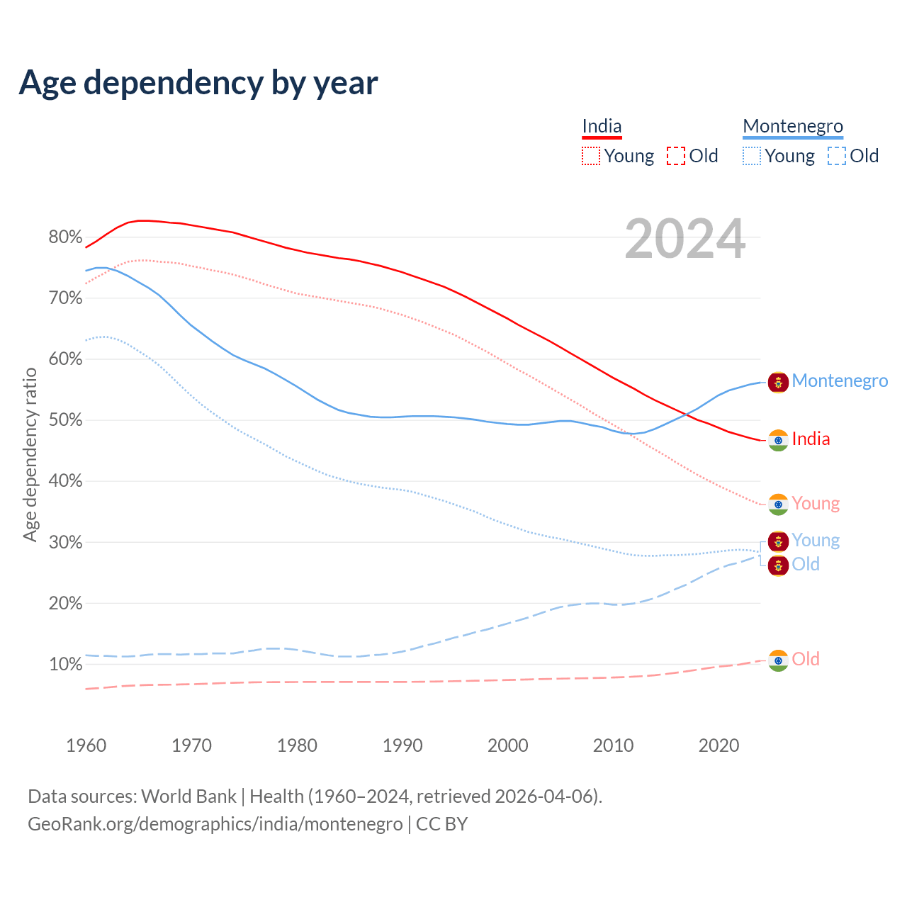 - India is ranked 108/196 by median age (oldest to youngest) vs 45/196 for Montenegro.