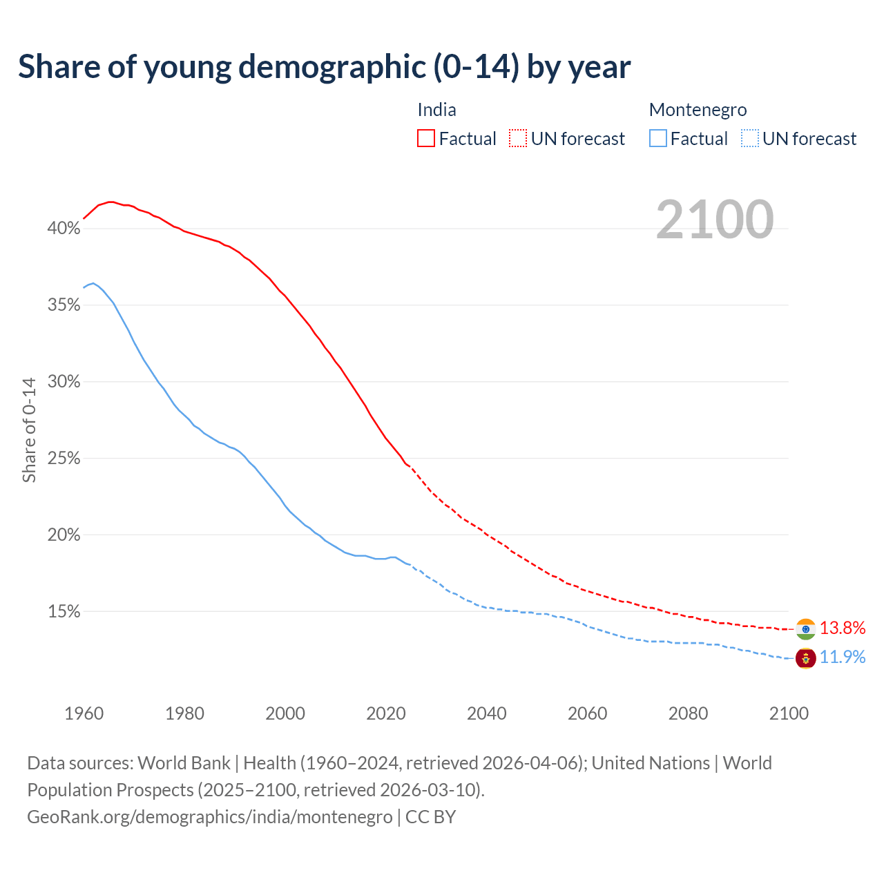 - The share of young demographic (0-15 years old) in India is 24.6% vs 18.1% in Montenegro.