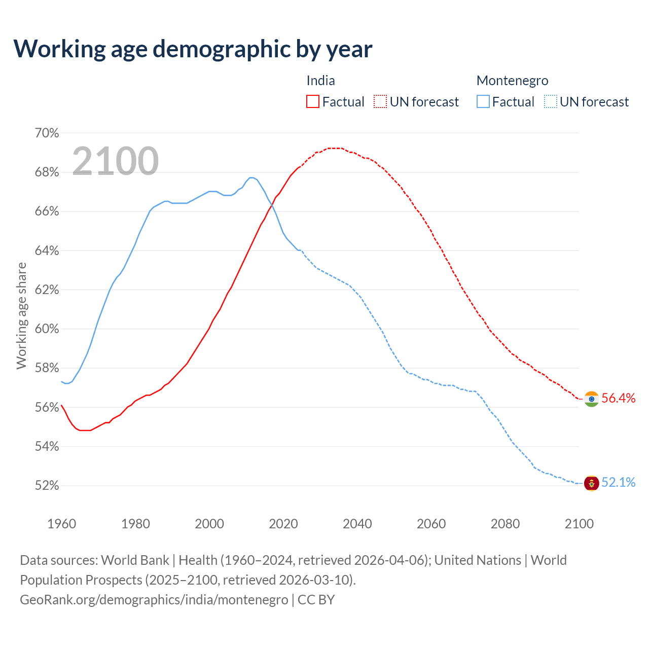 Median age India vs Montenegro, 1960-2100