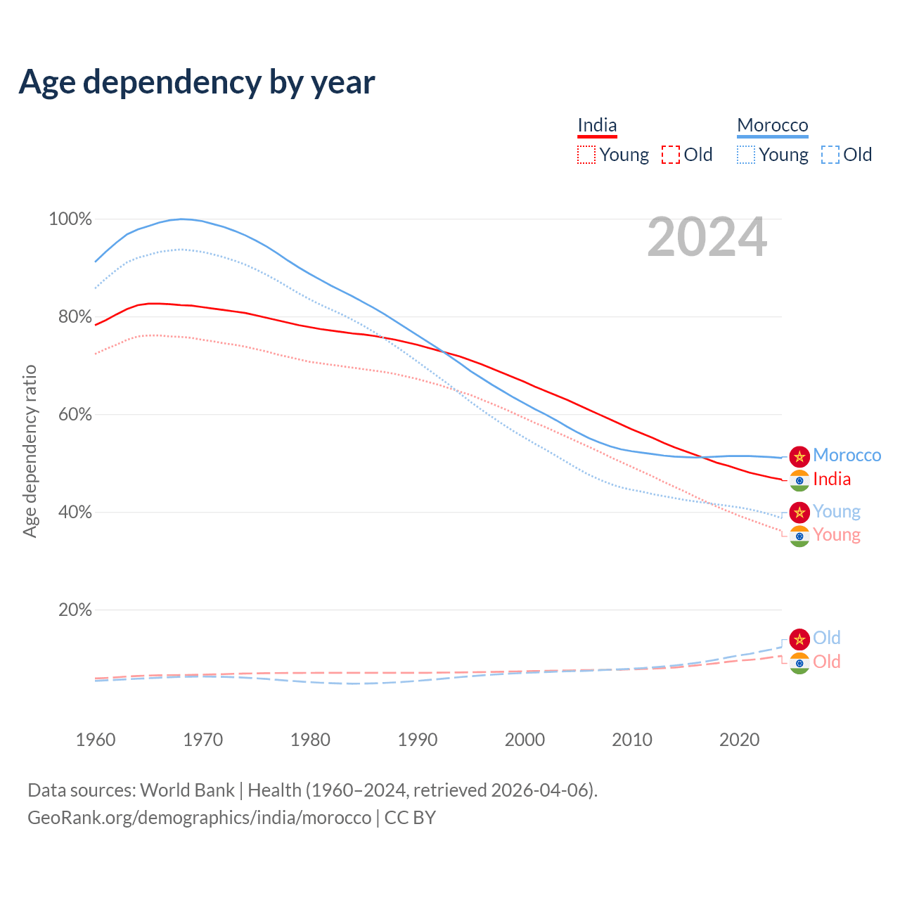 - India is ranked 108/196 by median age (oldest to youngest) vs 100/196 for Morocco.