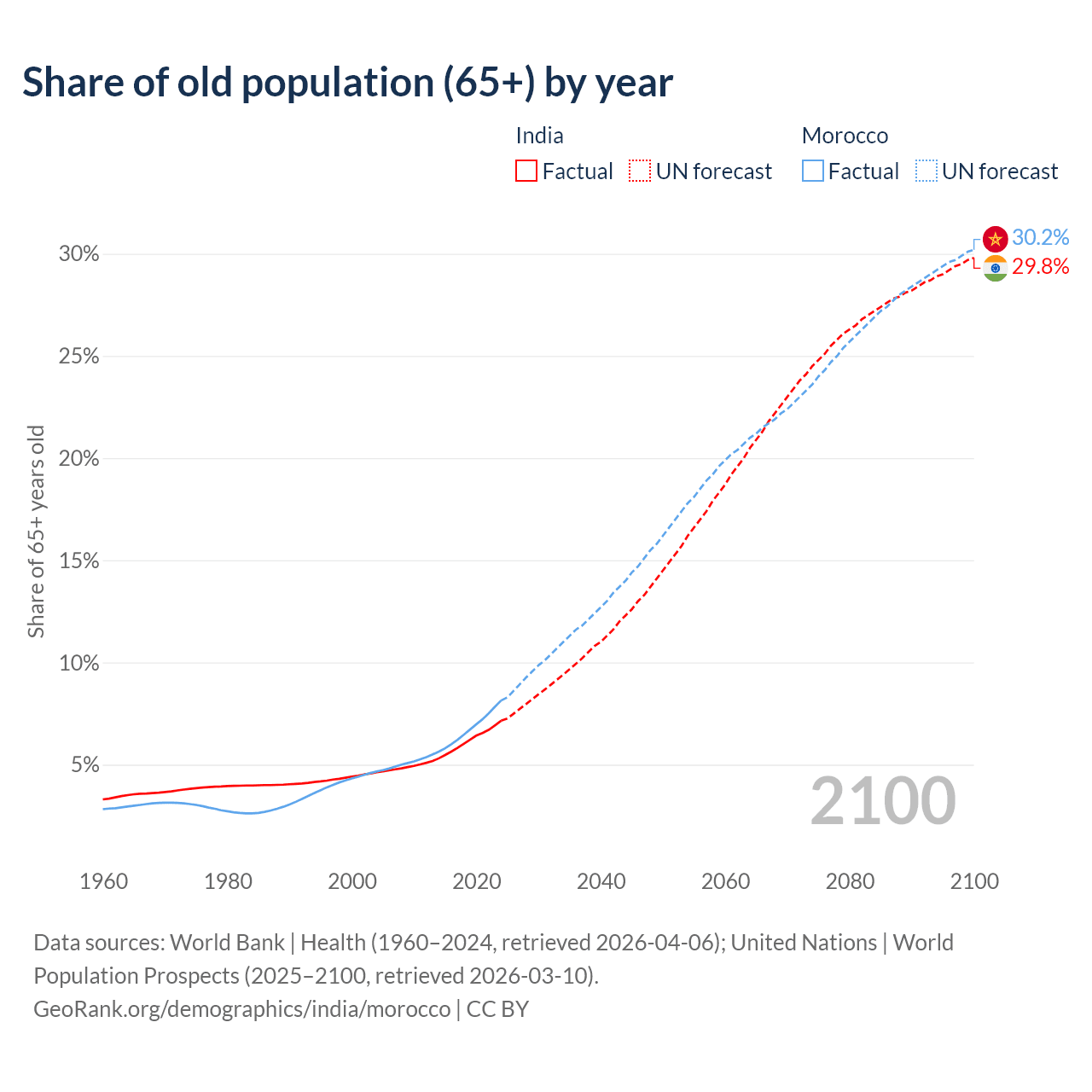 - The share of old-age demographic (65+) in India is 7.15% vs 8.14% in Morocco.