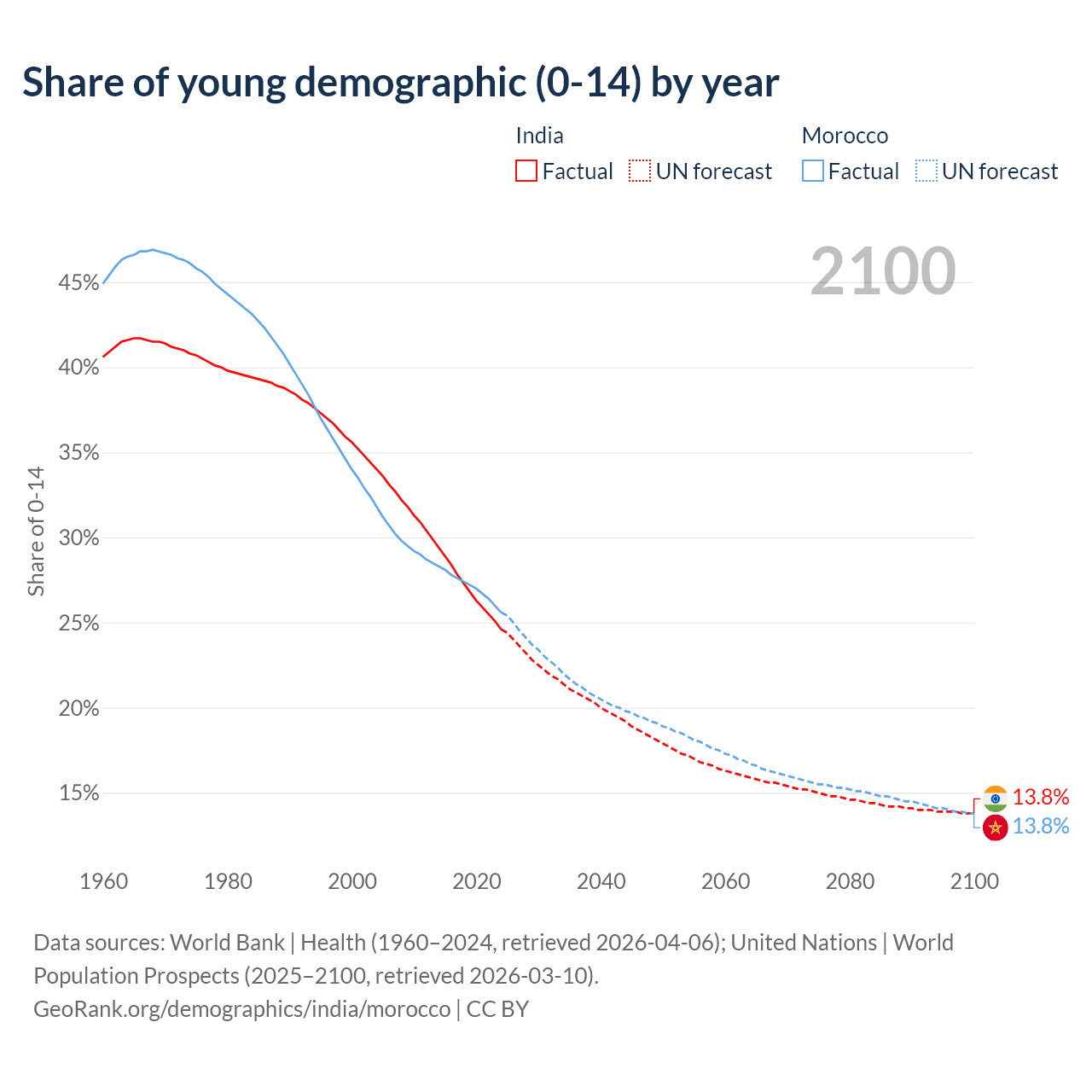 - The share of young demographic (0-15 years old) in India is 24.6% vs 25.6% in Morocco.