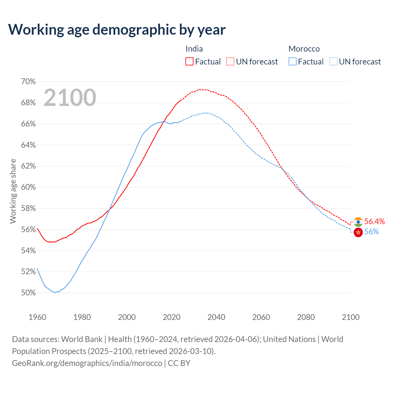 Median age India vs Morocco, 1960-2100