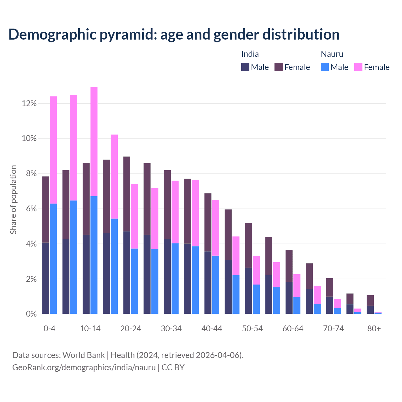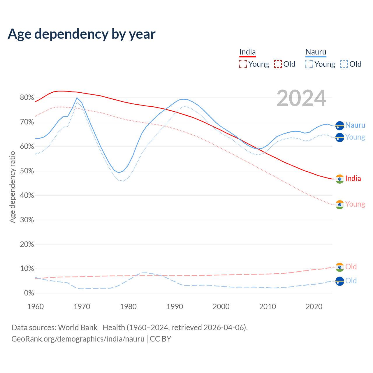 - India is ranked 108/196 by median age (oldest to youngest) vs 155/196 for Nauru.