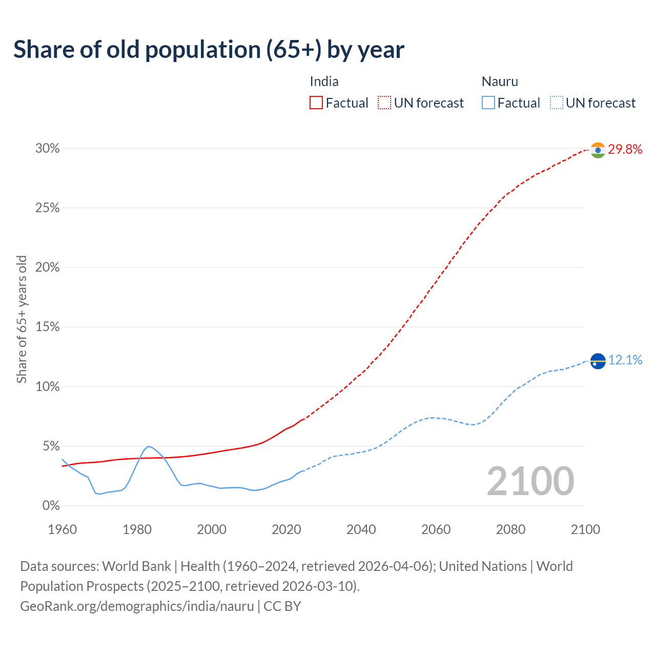 - The share of old-age demographic (65+) in India is 7.15% vs 2.85% in Nauru.