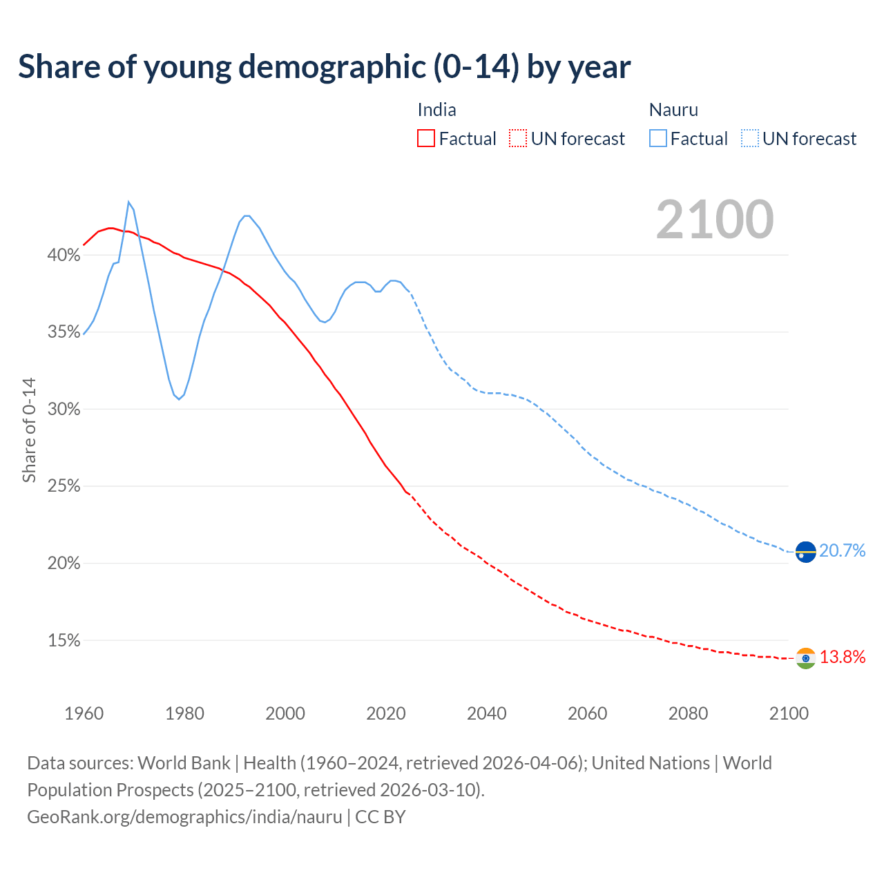 - The share of young demographic (0-15 years old) in India is 24.6% vs 37.8% in Nauru.