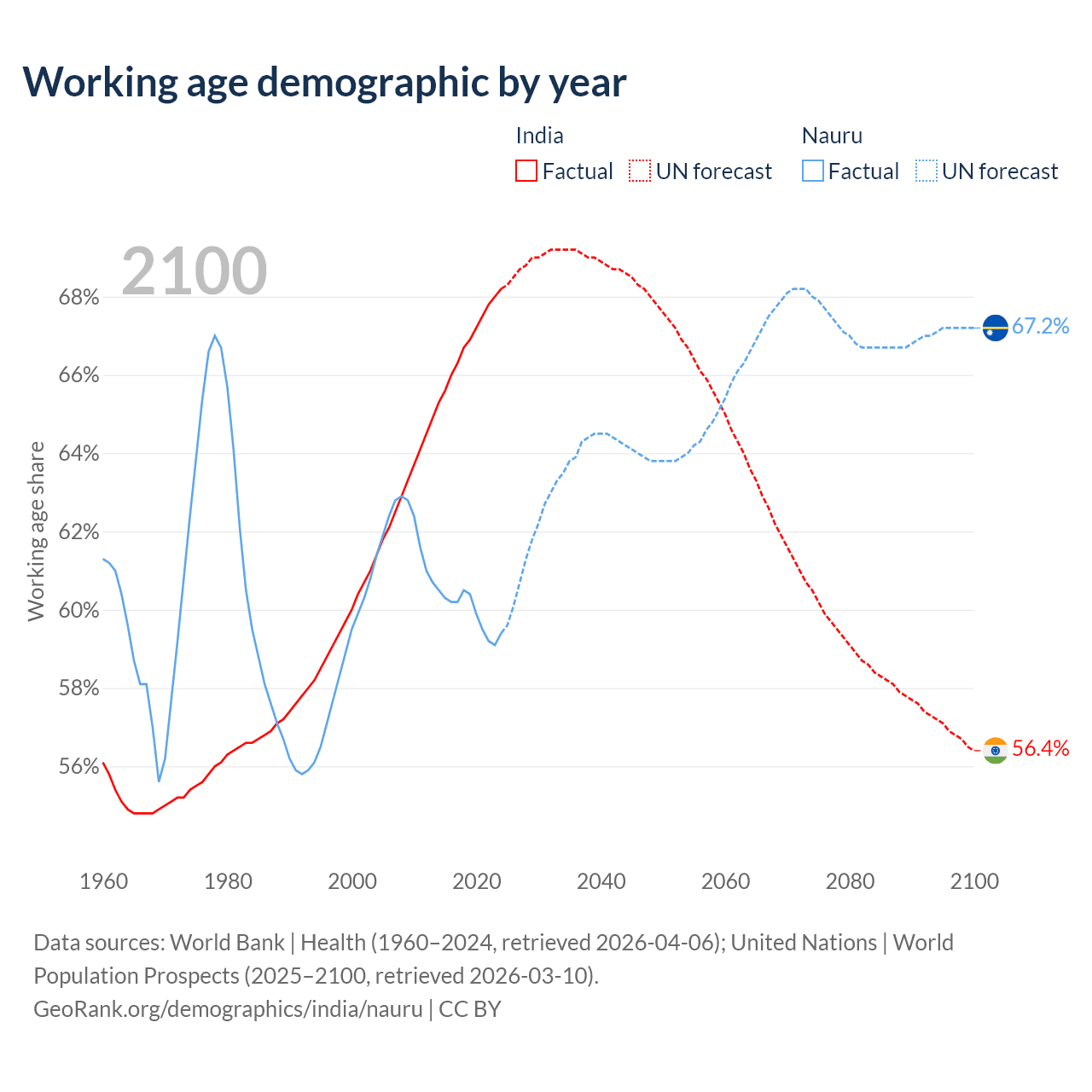 - India has 1.01B working age adults (aged 15-64) vs 7.2K in Nauru.