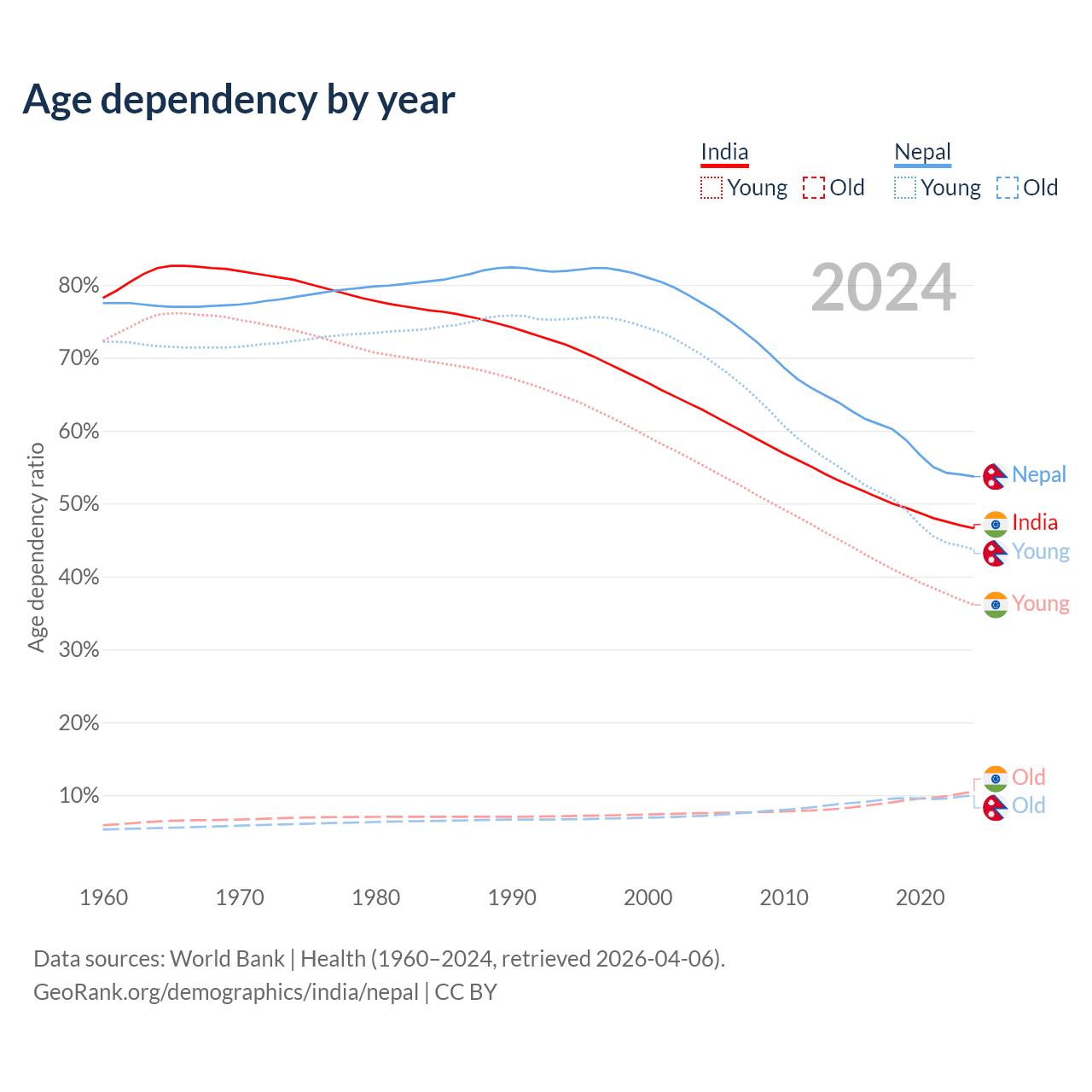 - India is ranked 108/196 by median age (oldest to youngest) vs 127/196 for Nepal.