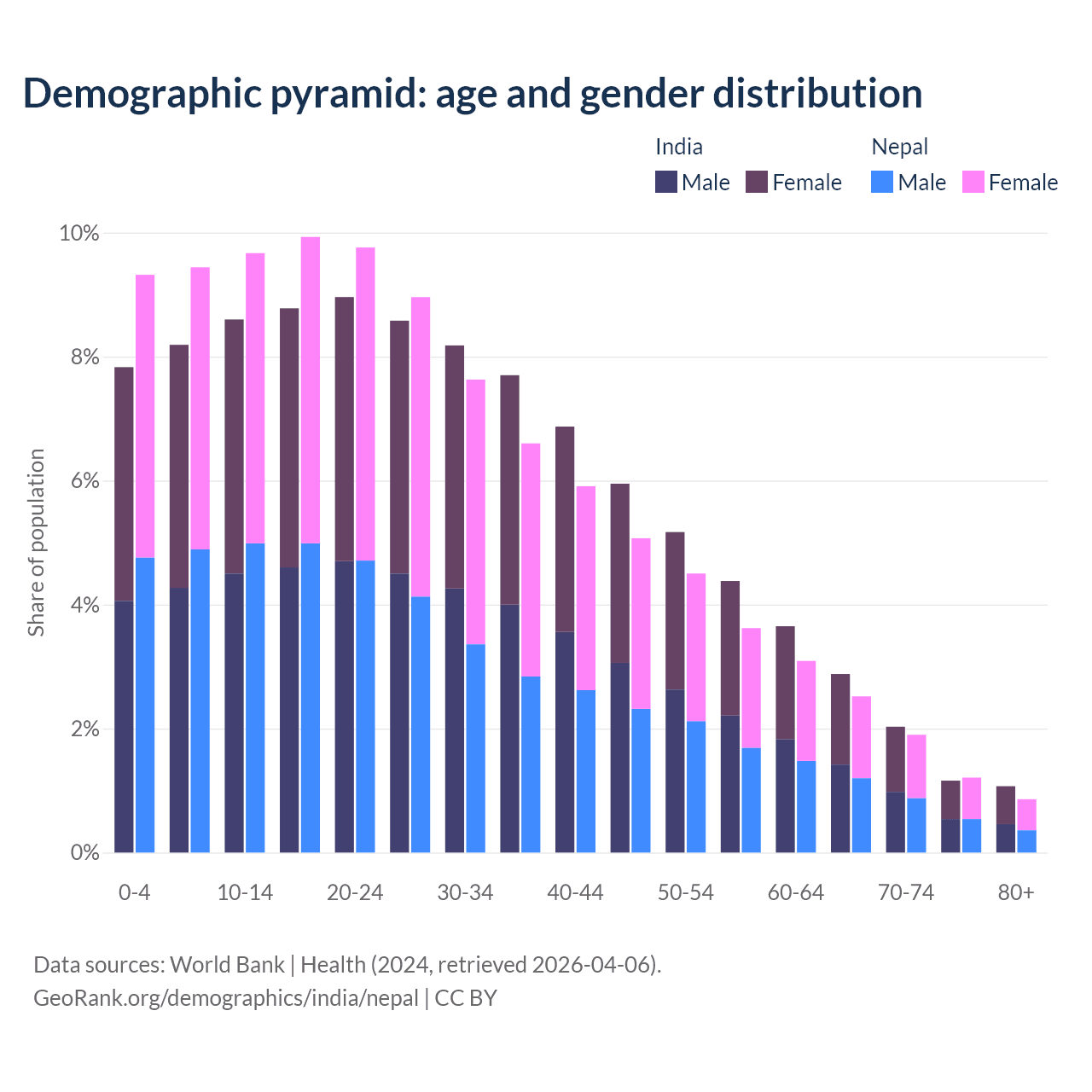 - As of 2026, the population of India is 1.48B vs 29.6M in Nepal - 50 times difference.