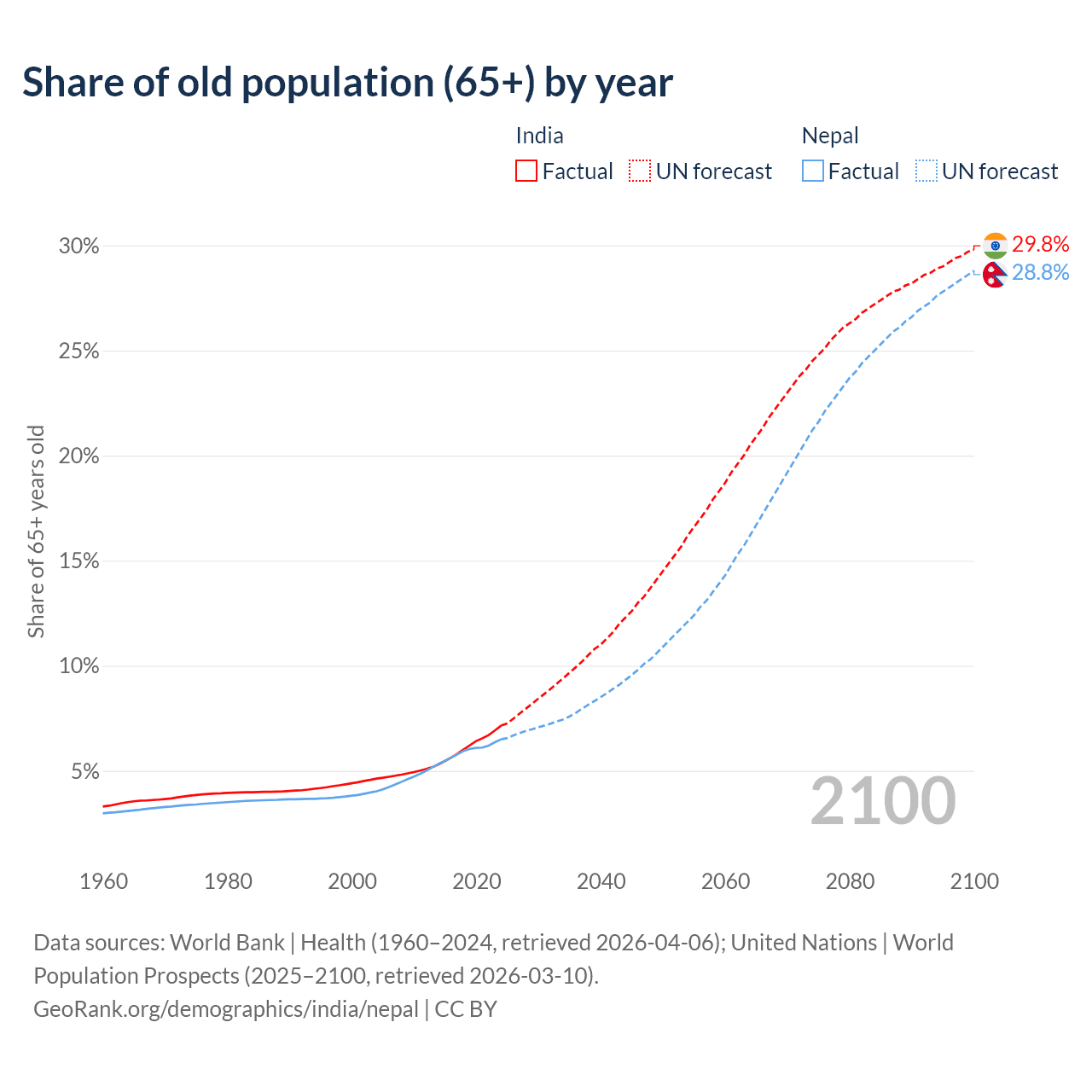 The share of older people aged 65 and over is 7.15% in India and 6.5% in Nepal. Life expectancy in India compared to Nepal .
