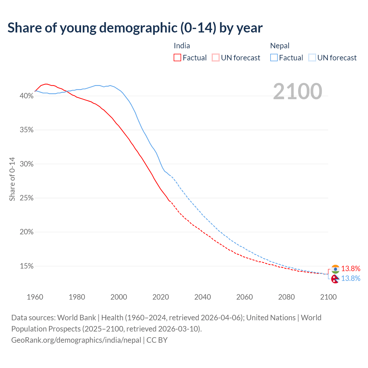 - The share of young demographic (0-15 years old) in India is 24.6% vs 28.4% in Nepal.