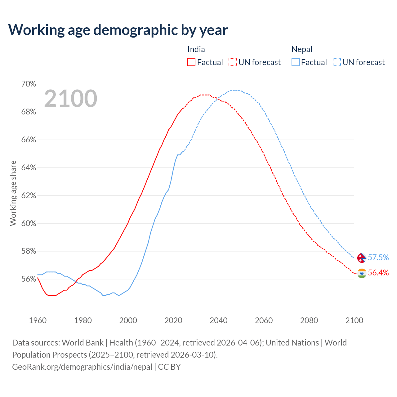 - India has 1.01B working age adults (aged 15-64) vs 19.3M in Nepal.