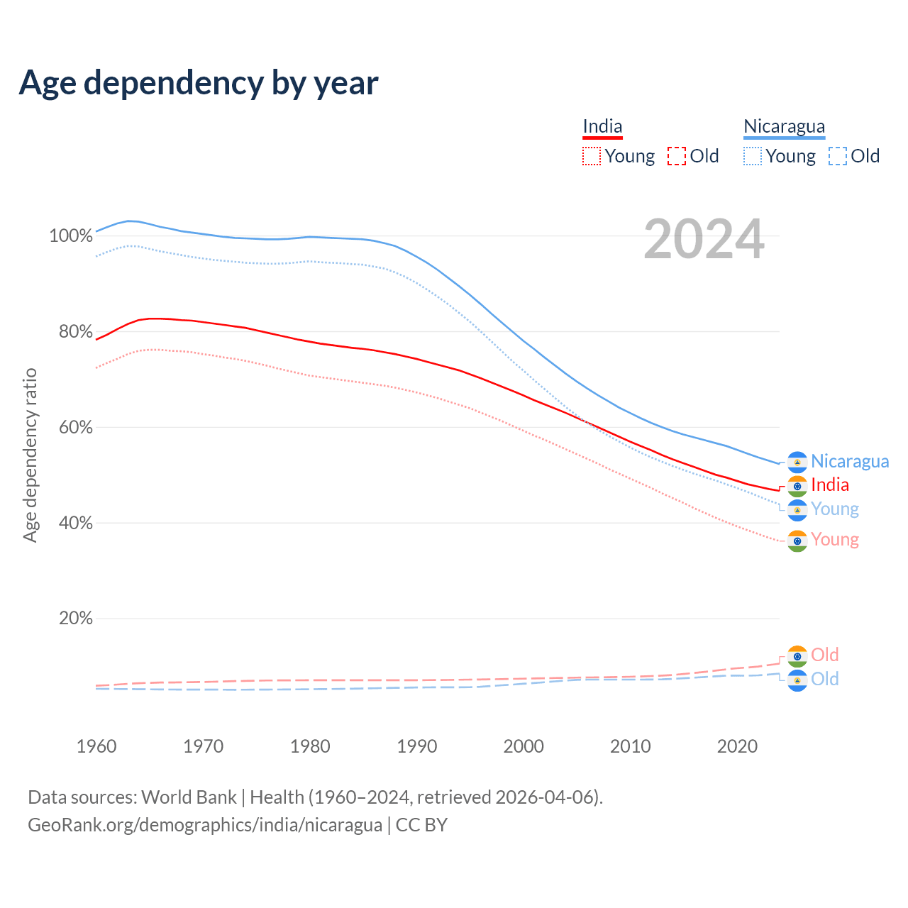 - India is ranked 108/196 by median age (oldest to youngest) vs 125/196 for Nicaragua.