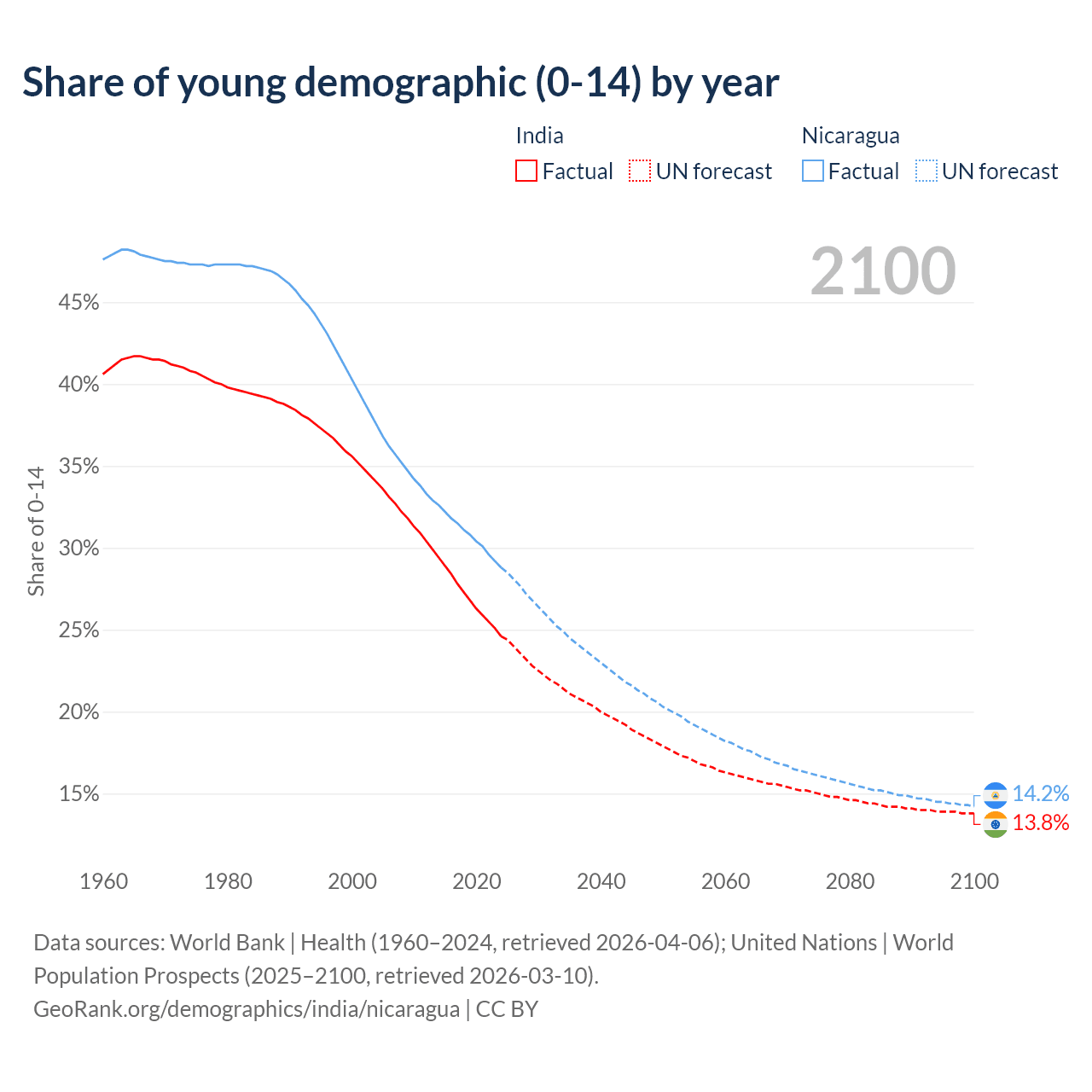 - The share of young demographic (0-15 years old) in India is 24.6% vs 28.8% in Nicaragua.