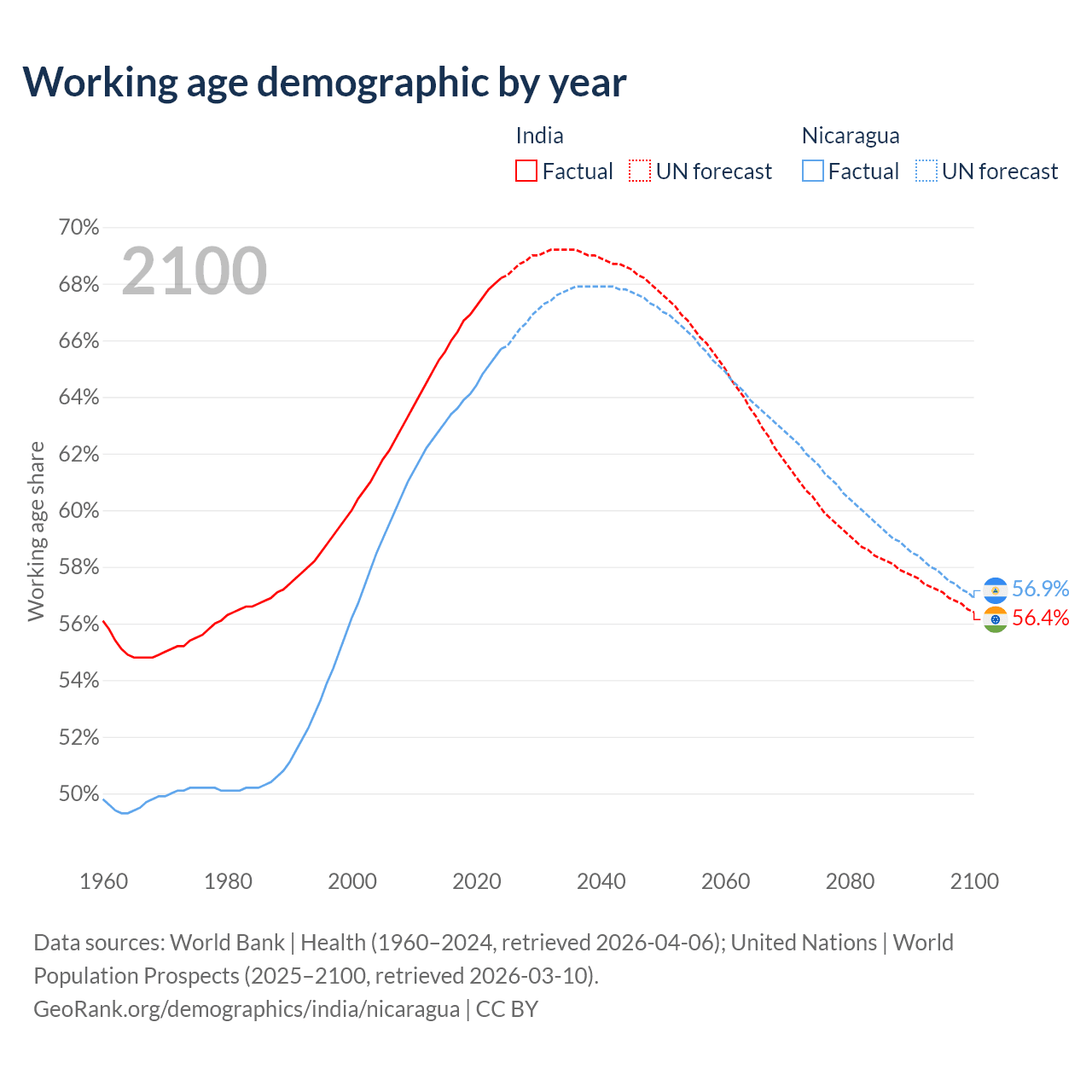 Median age India vs Nicaragua, 1960-2100