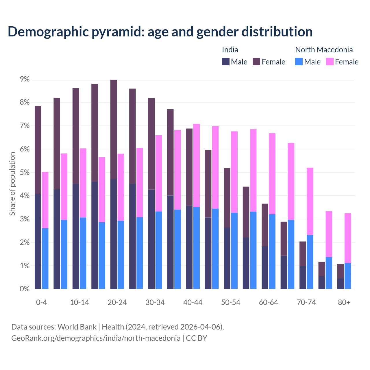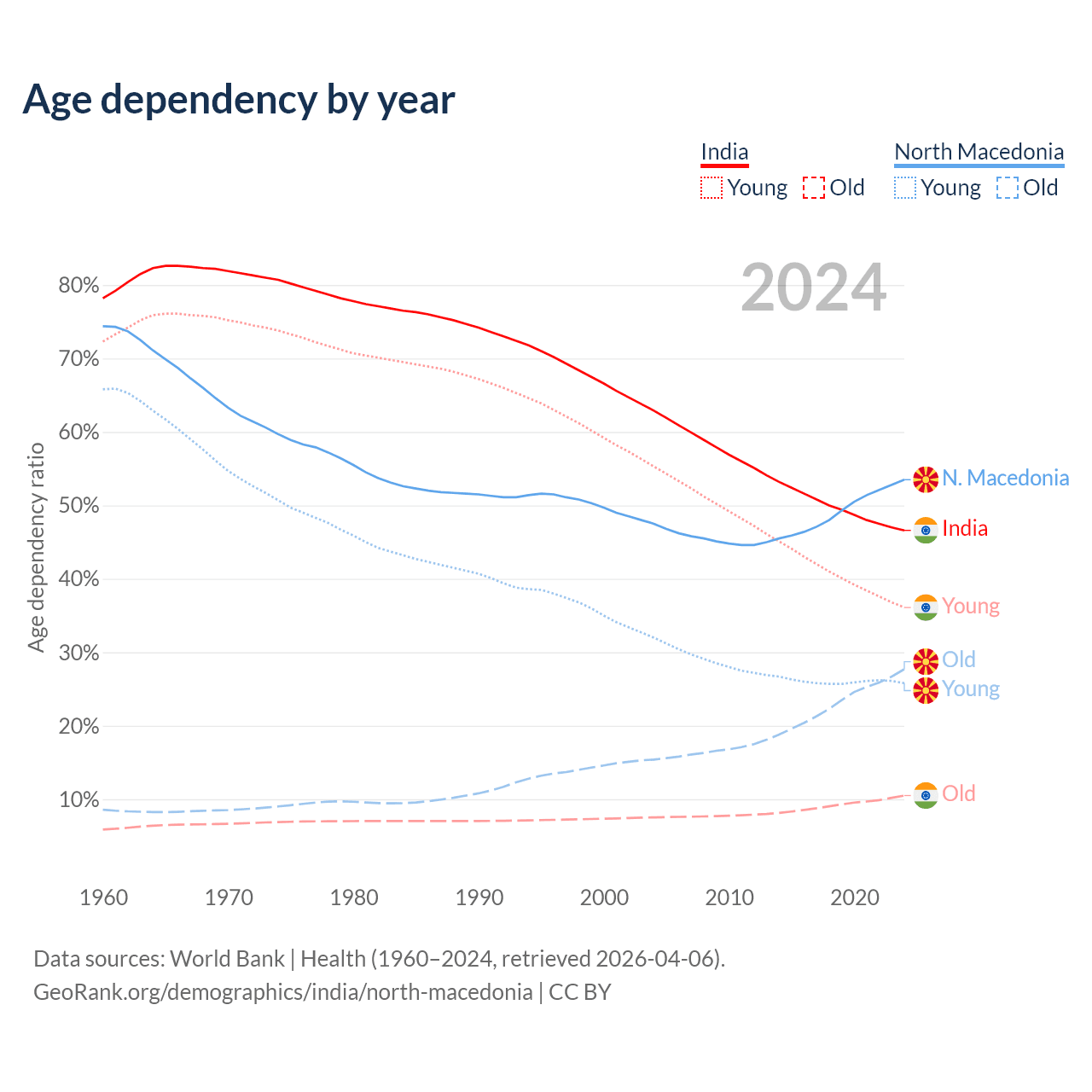 - India is ranked 108/196 by median age (oldest to youngest) vs 37/196 for North Macedonia.