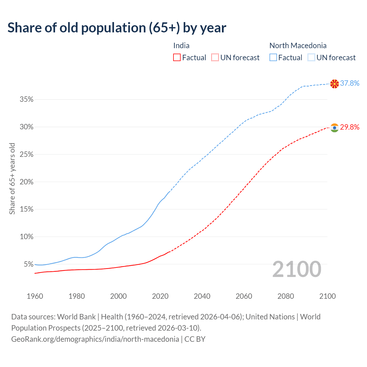 The share of older people aged 65 and over is 7.15% in India and 18% in North Macedonia. Life expectancy in India compared to North Macedonia .