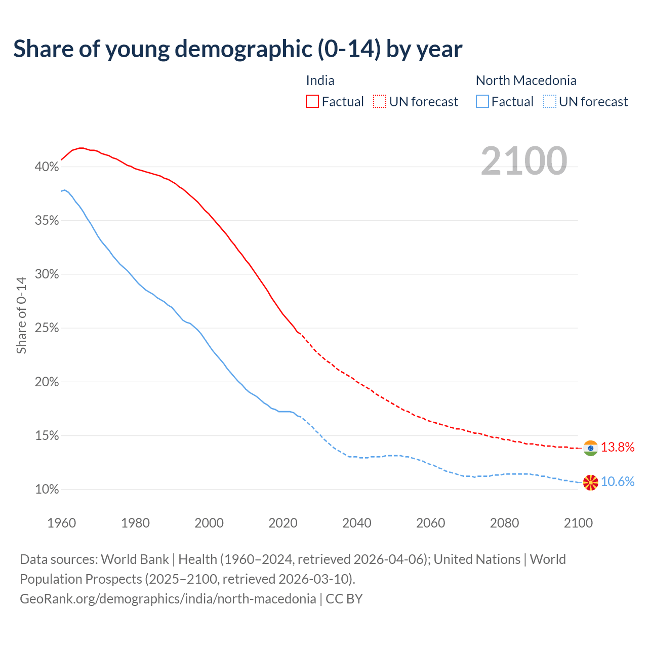 - The share of young demographic (0-15 years old) in India is 24.6% vs 16.8% in North Macedonia.