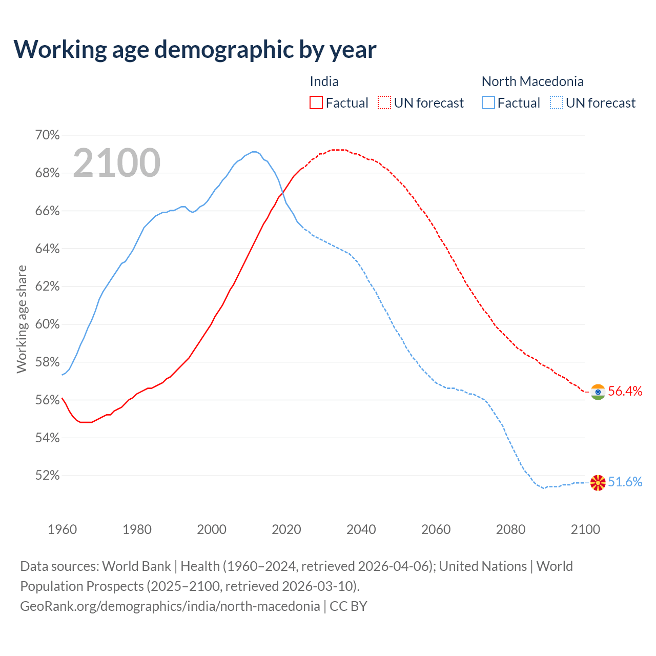 - India has 1.01B working age adults (aged 15-64) vs 1.18M in North Macedonia.