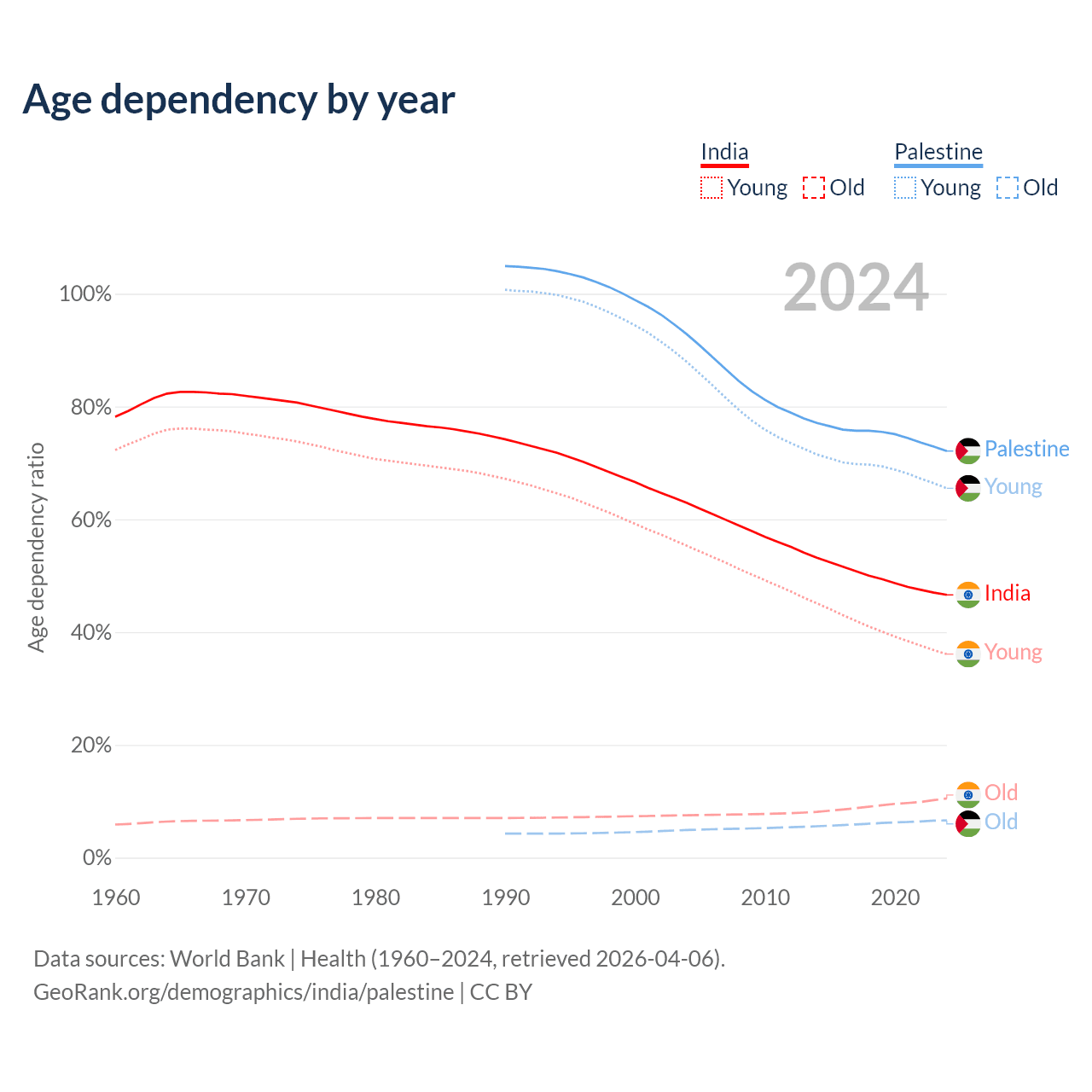 - India is ranked 108/196 by median age (oldest to youngest) vs 157/196 for Palestine.