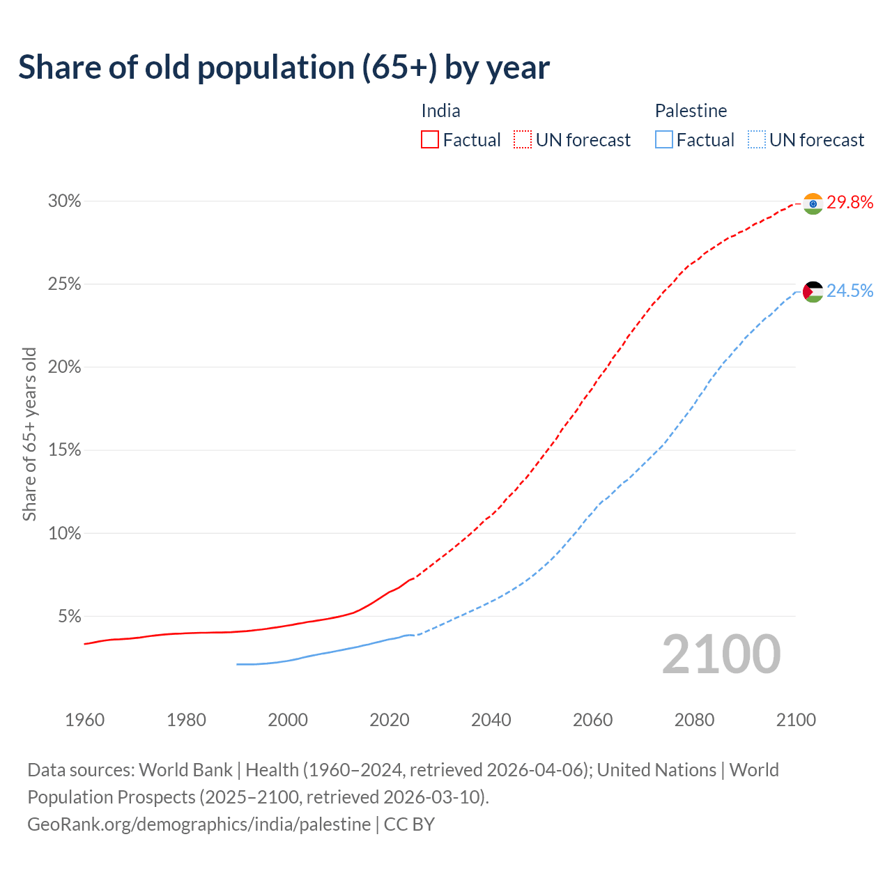 - The share of old-age demographic (65+) in India is 7.15% vs 3.84% in Palestine.
