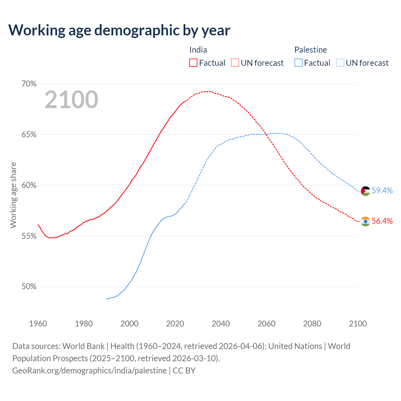 - India has 1.01B working age adults (aged 15-64) vs 3.2M in Palestine.