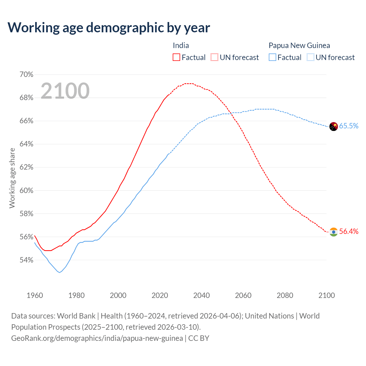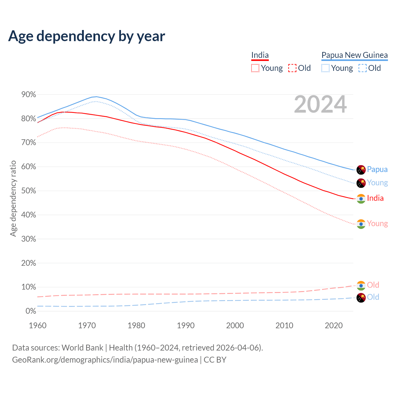 - India is ranked 108/196 by median age (oldest to youngest) vs 140/196 for Papua New Guinea.
