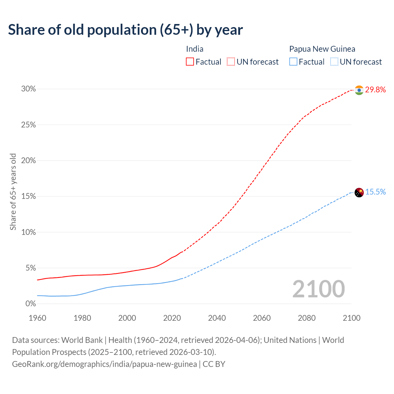 - The share of old-age demographic (65+) in India is 7.15% vs 3.46% in Papua New Guinea.