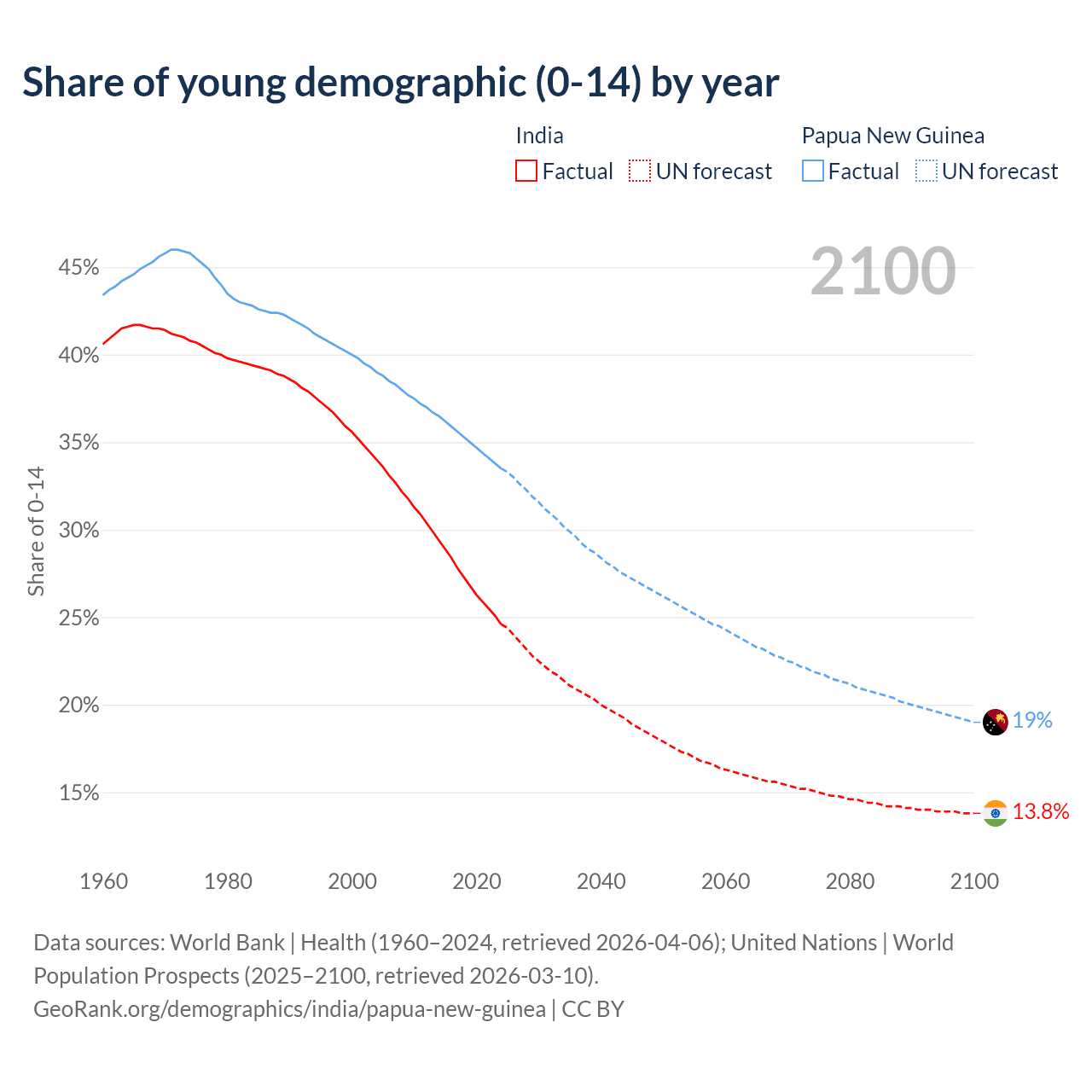 - The share of young demographic (0-15 years old) in India is 24.6% vs 33.5% in Papua New Guinea.