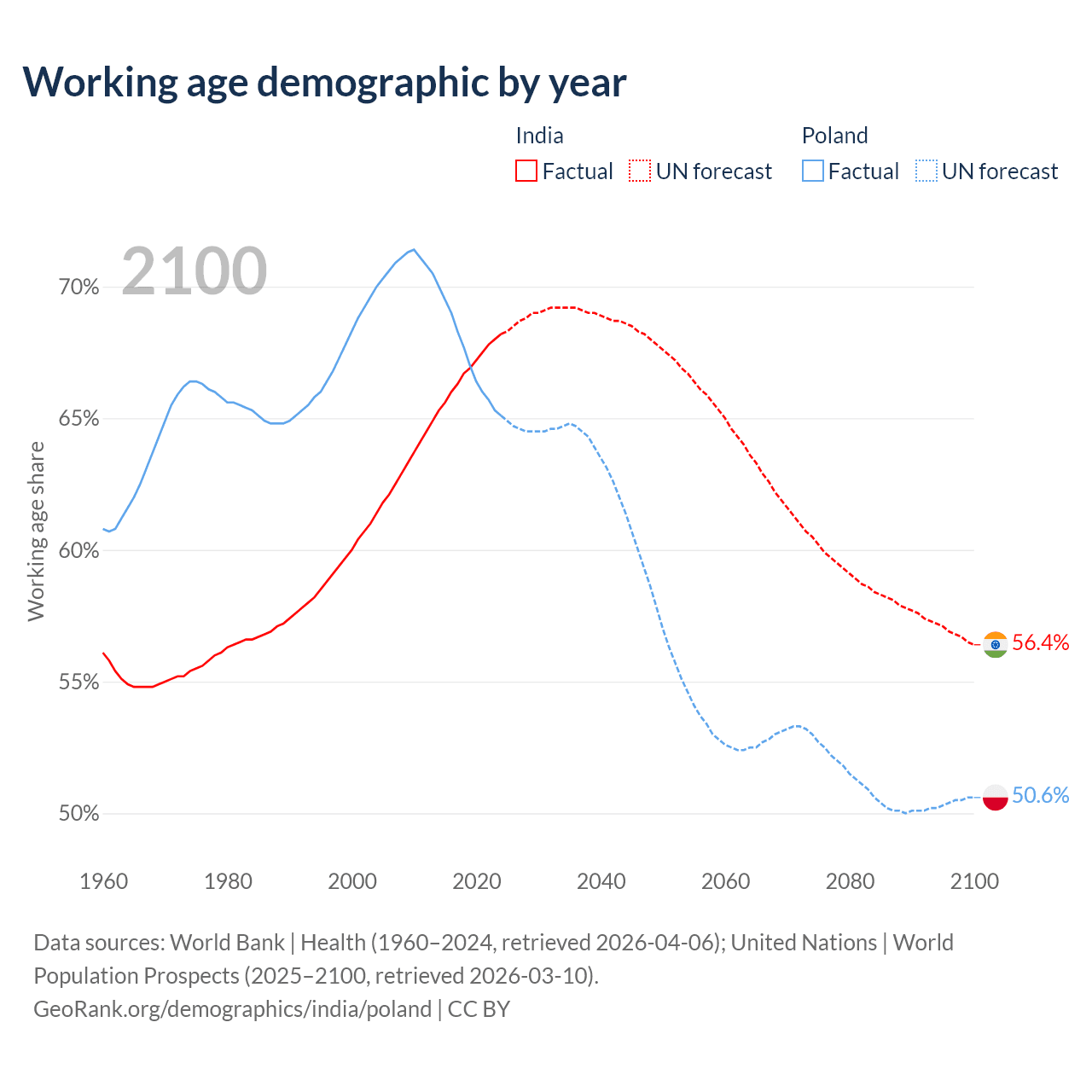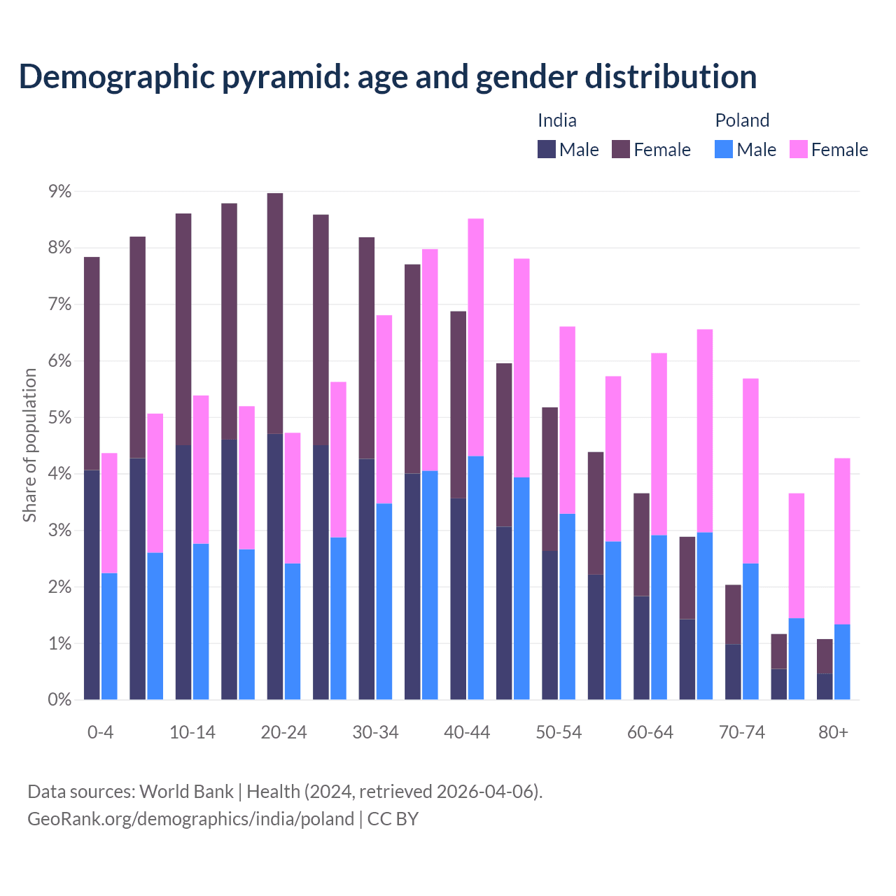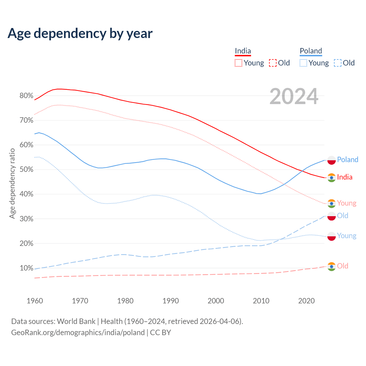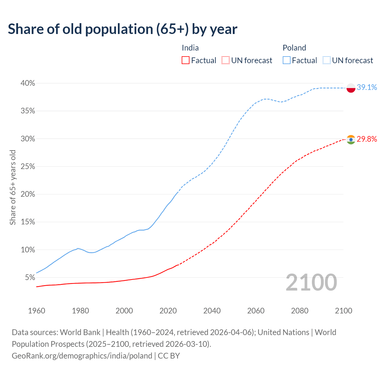 The share of older people aged 65 and over is 7.15% in India and 20.1% in Poland. Life expectancy in India compared to Poland .