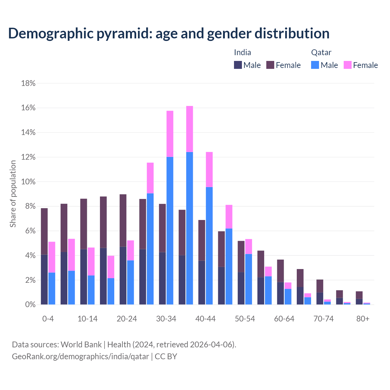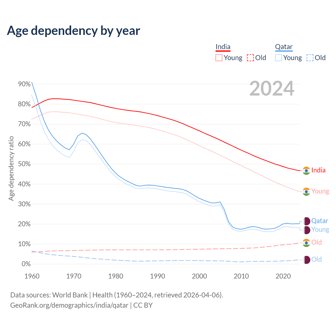 - India is ranked 108/196 by median age (oldest to youngest) vs 78/196 for Qatar.