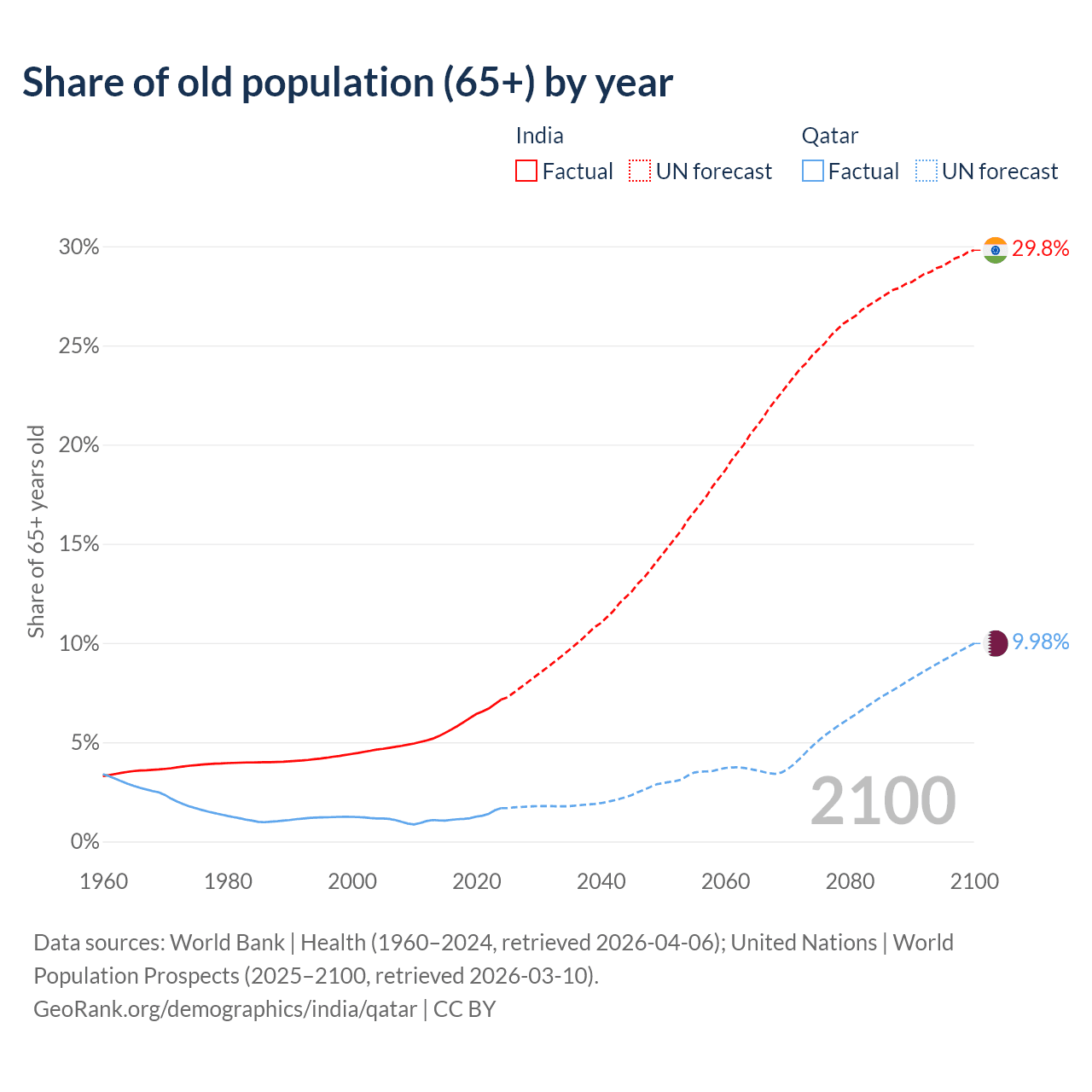 - The share of old-age demographic (65+) in India is 7.15% vs 1.68% in Qatar.