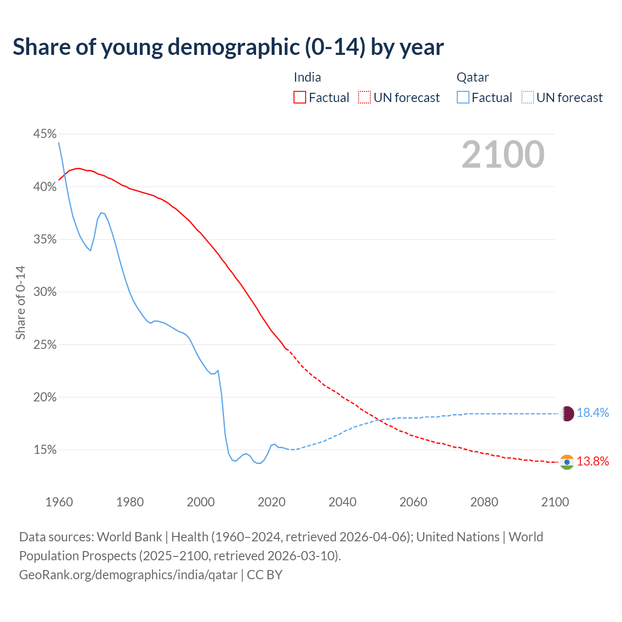 - The share of young demographic (0-15 years old) in India is 24.6% vs 15.1% in Qatar.