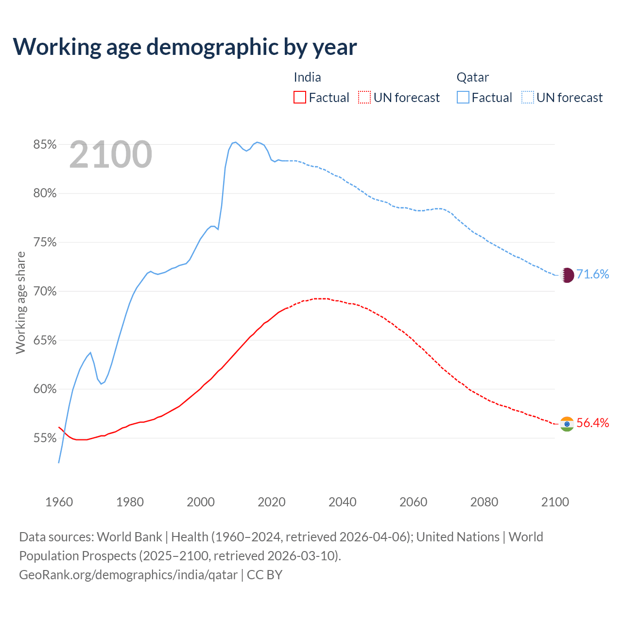 - India has 1.01B working age adults (aged 15-64) vs 2.5M in Qatar.