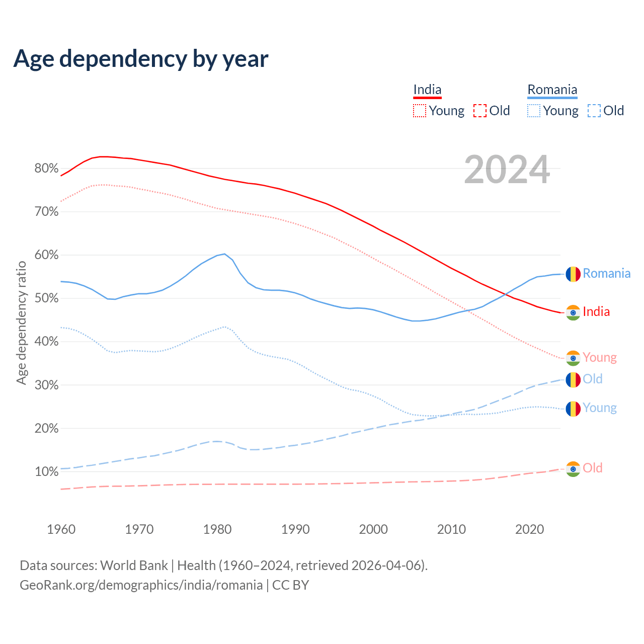 - India is ranked 108/196 by median age (oldest to youngest) vs 23/196 for Romania.