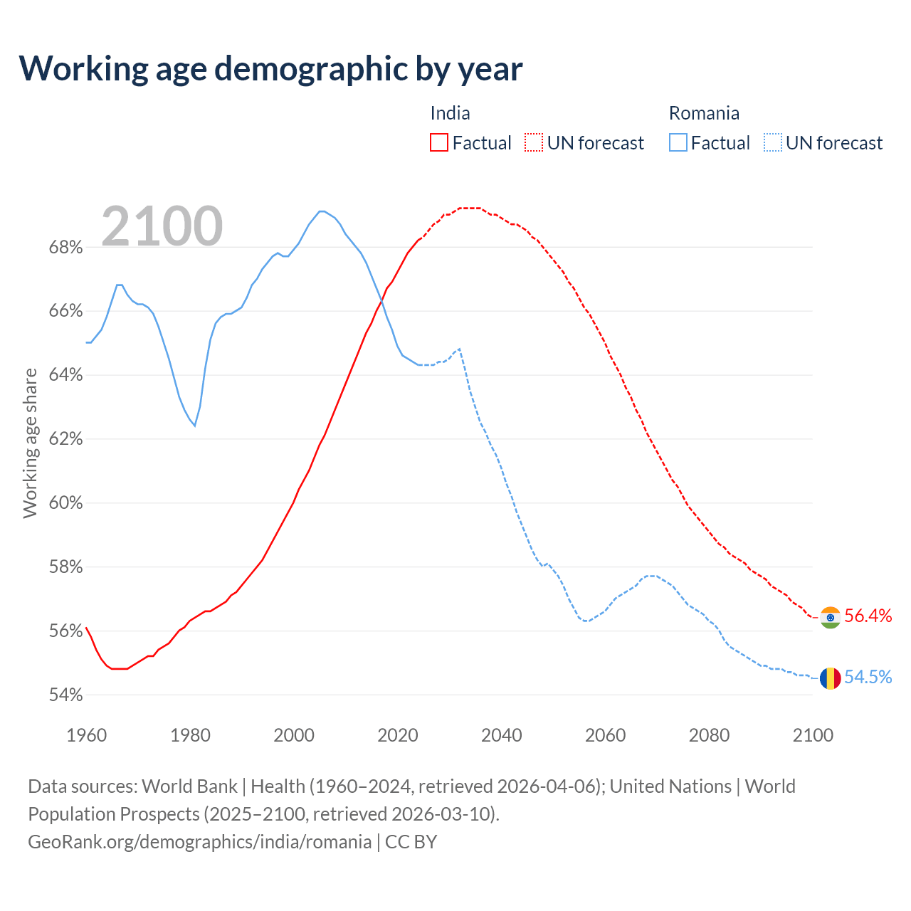 Median age India vs Romania, 1960-2100