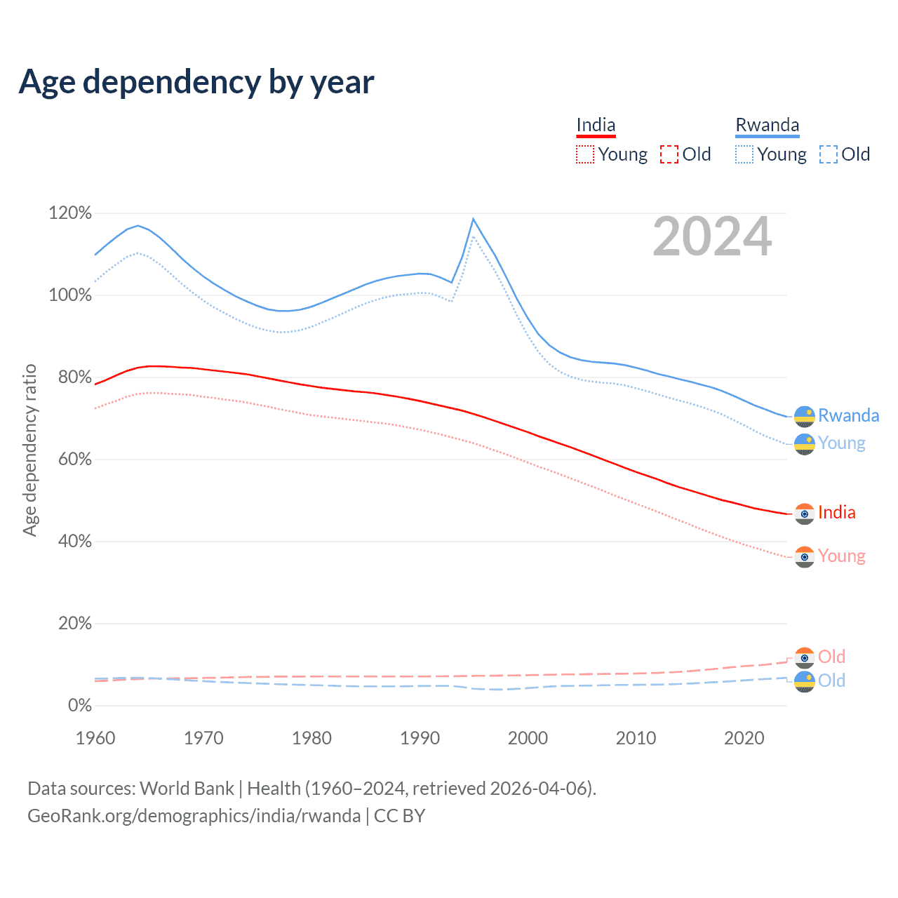 - India is ranked 108/196 by median age (oldest to youngest) vs 160/196 for Rwanda.