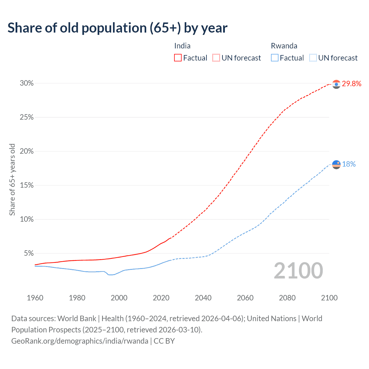 - The share of old-age demographic (65+) in India is 7.15% vs 3.93% in Rwanda.
