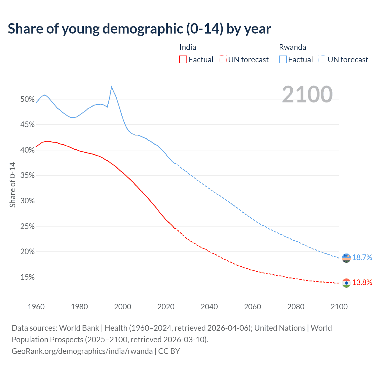 - The share of young demographic (0-15 years old) in India is 24.6% vs 37.4% in Rwanda.