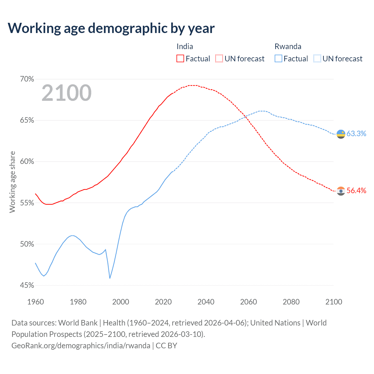 - India has 1.01B working age adults (aged 15-64) vs 8.79M in Rwanda.