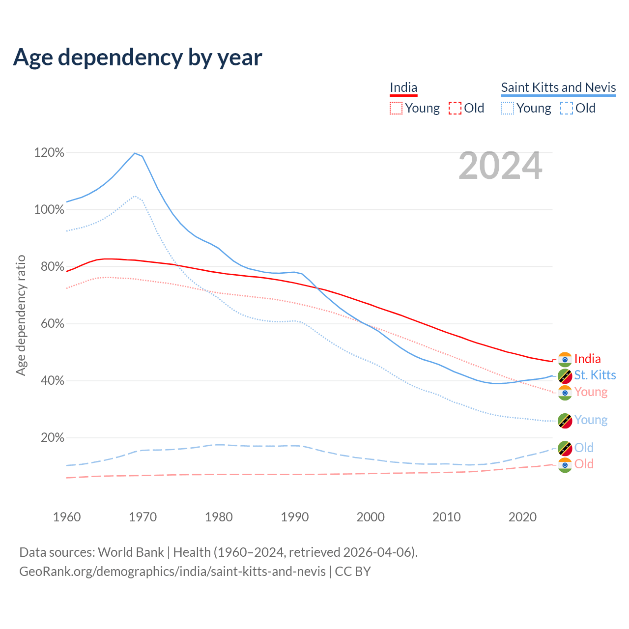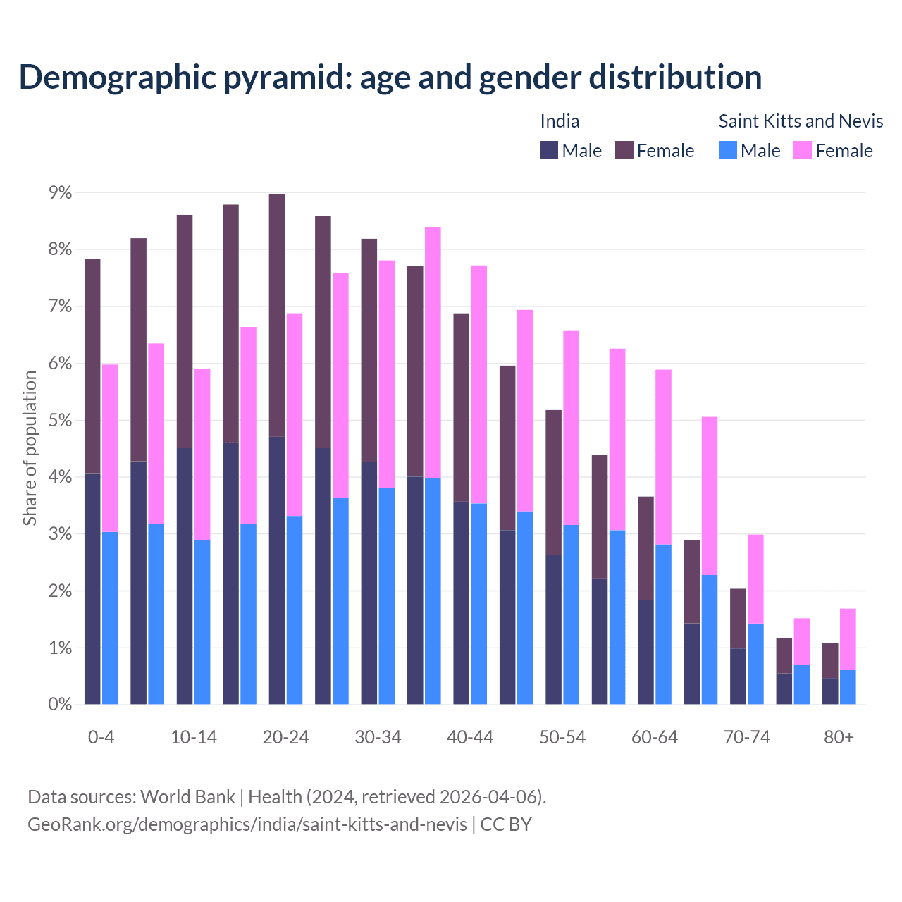 - India is ranked 108/196 by median age (oldest to youngest) vs 69/196 for Saint Kitts and Nevis.