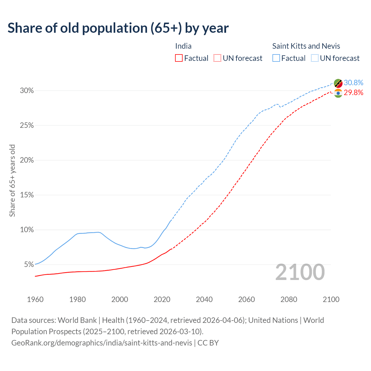 The share of older people aged 65 and over is 7.15% in India and 11.2% in Saint Kitts and Nevis. Life expectancy in India compared to Saint Kitts and Nevis .