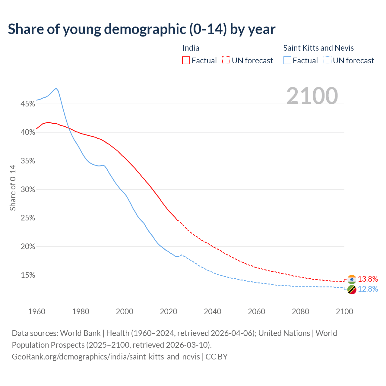 - The share of young demographic (0-15 years old) in India is 24.6% vs 18.2% in Saint Kitts and Nevis.