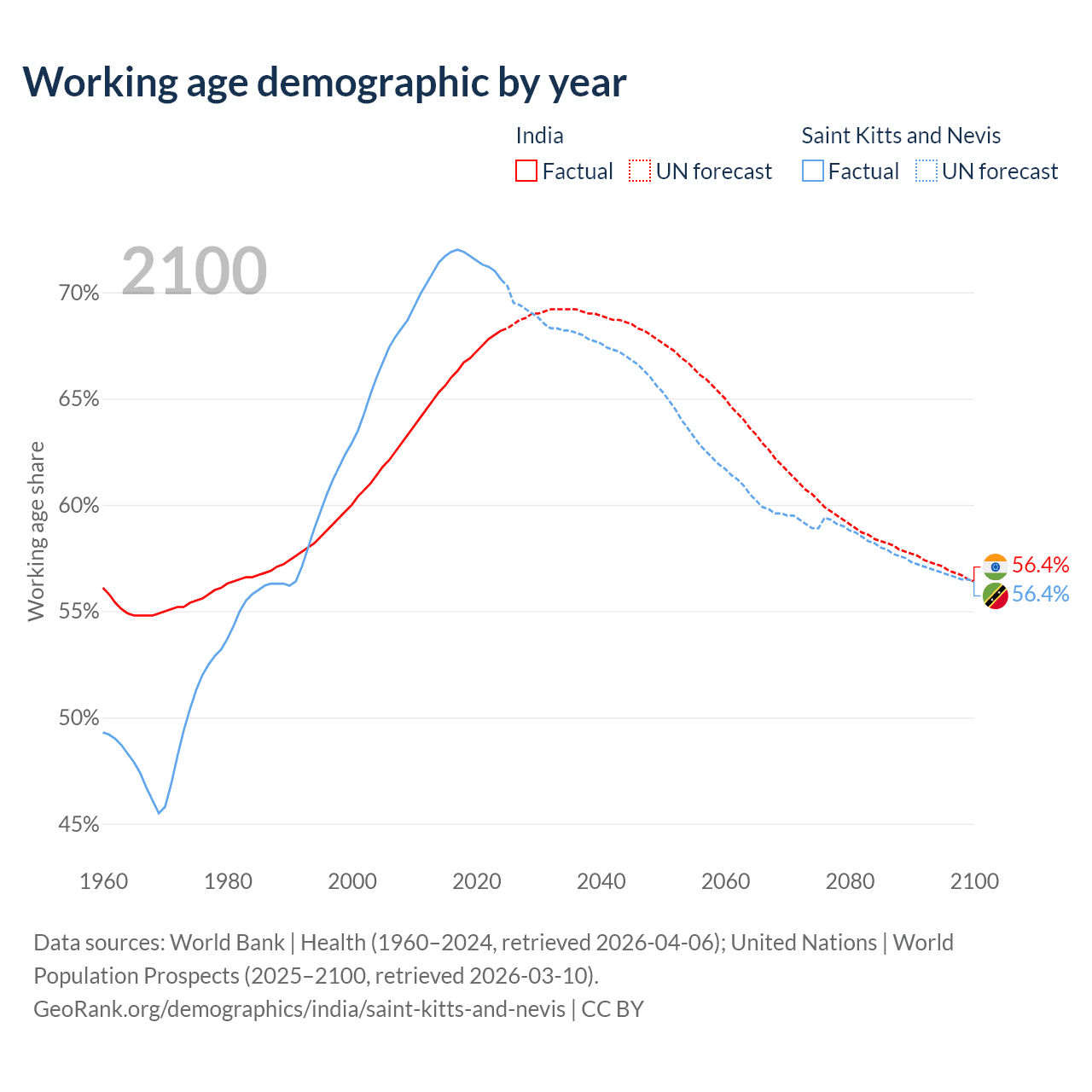 - India has 1.01B working age adults (aged 15-64) vs 33.2K in Saint Kitts and Nevis.